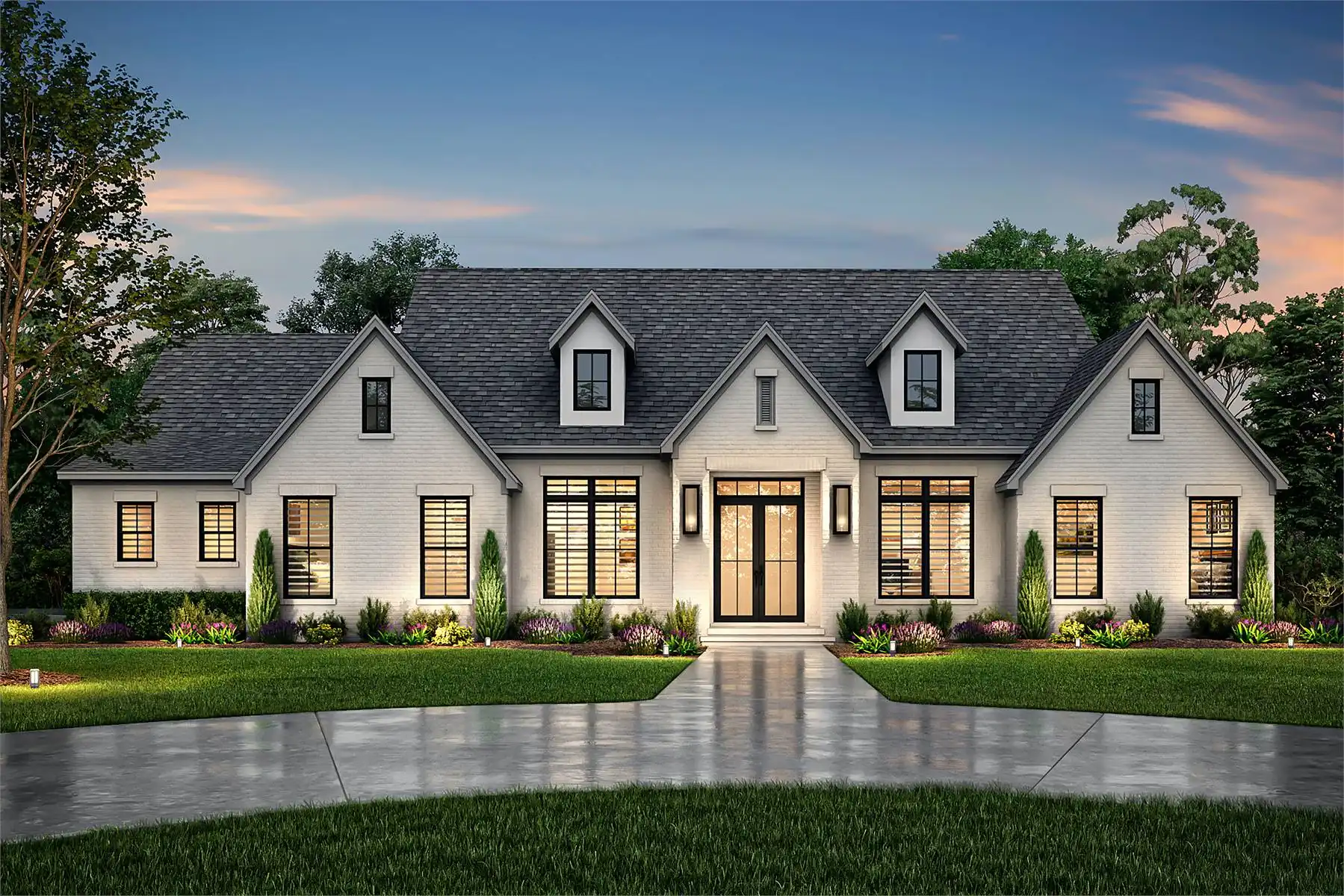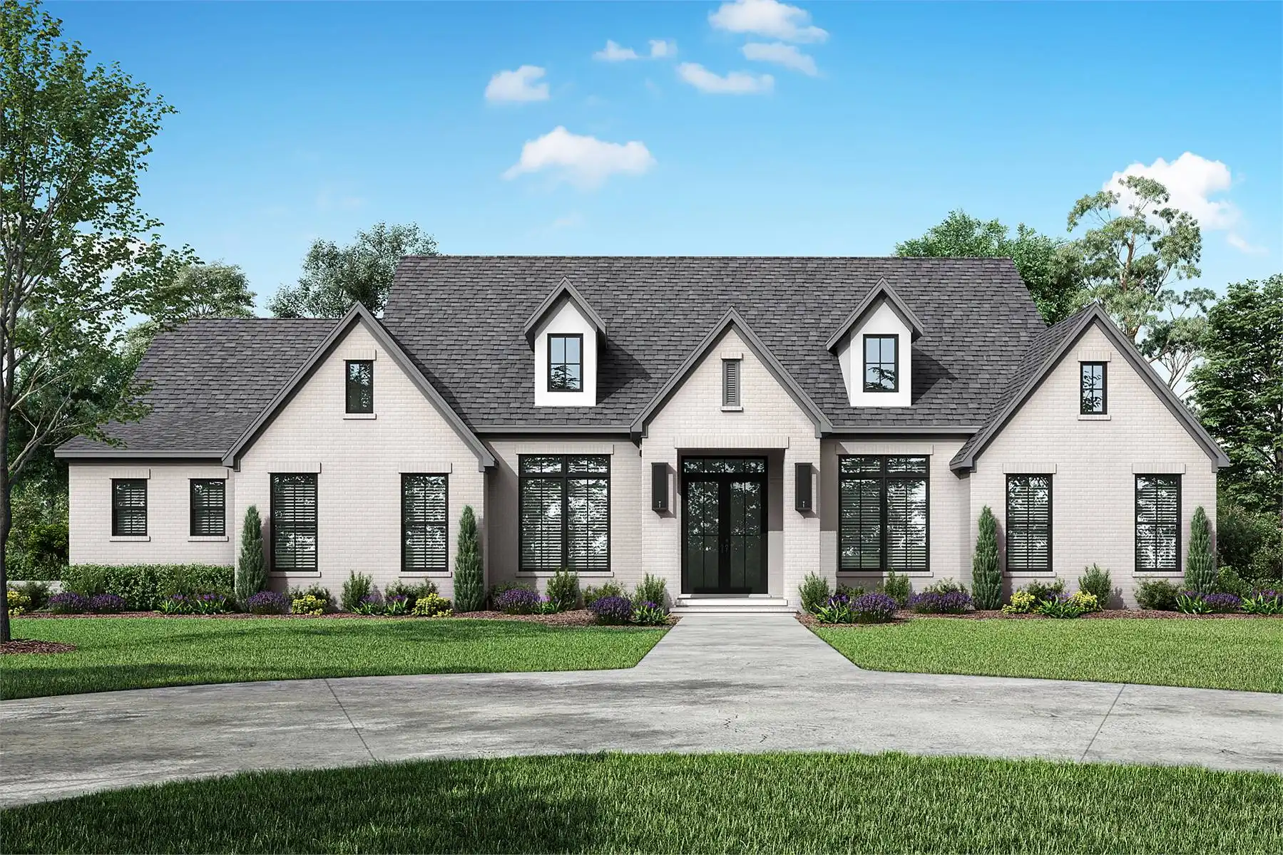 House Plan 9285 is a beautiful home with so much for a family to appreciate in 2,859 square feet! All main living areas are on one level, with open-concept living making up the heart of the home The bedrooms are split across this, with the luxury primary suite boasting a five-piece bath while the other two bedrooms each have their own private three-piece suites. There's also a powder room to serve guests. Make sure not to miss other highlights like the study, kids' room, huge walk-in pantry, bonus room, and outdoor kitchen on the back porch!