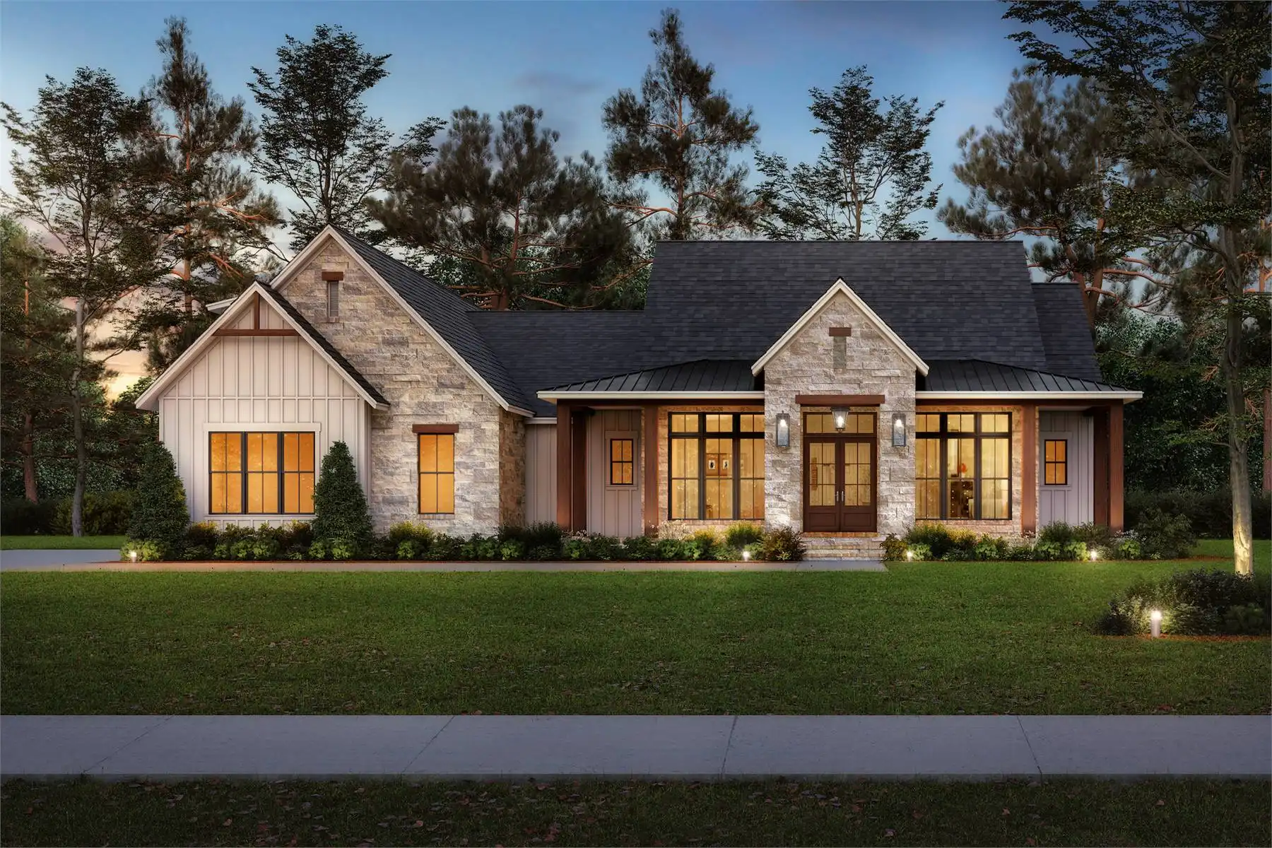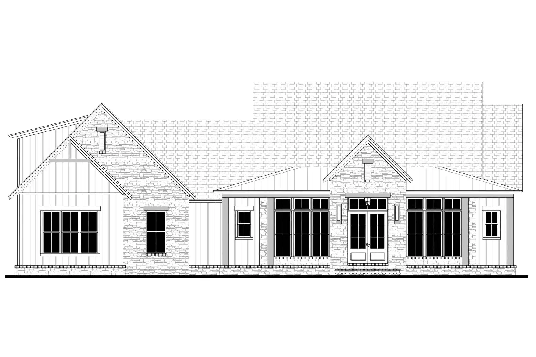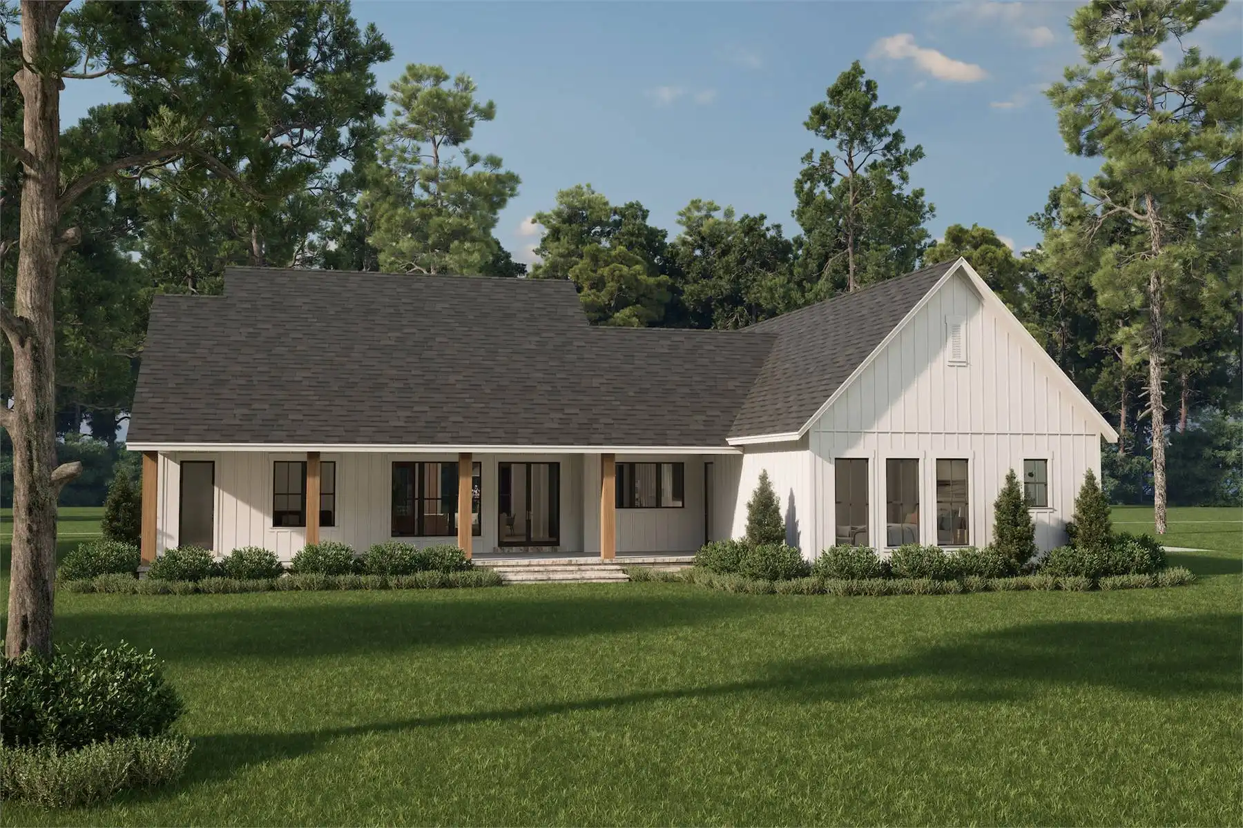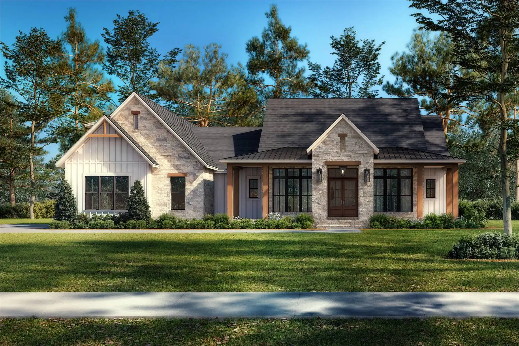 Explore the charm of country living with House Plan 9291, a modern cottage where thoughtful design meets timeless appeal. The exterior blends stone and board-and-batten siding for an inviting, elegant look. Inside, the open-concept great room, dining area, and kitchen feature a vaulted ceiling with exposed decorative beams, perfect for family living and entertaining. This home includes three spacious bedrooms and three and a half baths, with the main suite offering a vaulted ceiling, luxurious bath, and a generously sized closet accessible through the laundry room. Enjoy the outdoors from the semi wrap-around porch and customize the versatile bonus room to suit your family's needs. Experience the ideal combination of style and functionality in this modern farmhouse, crafted for those who love to entertain and appreciate fine details.