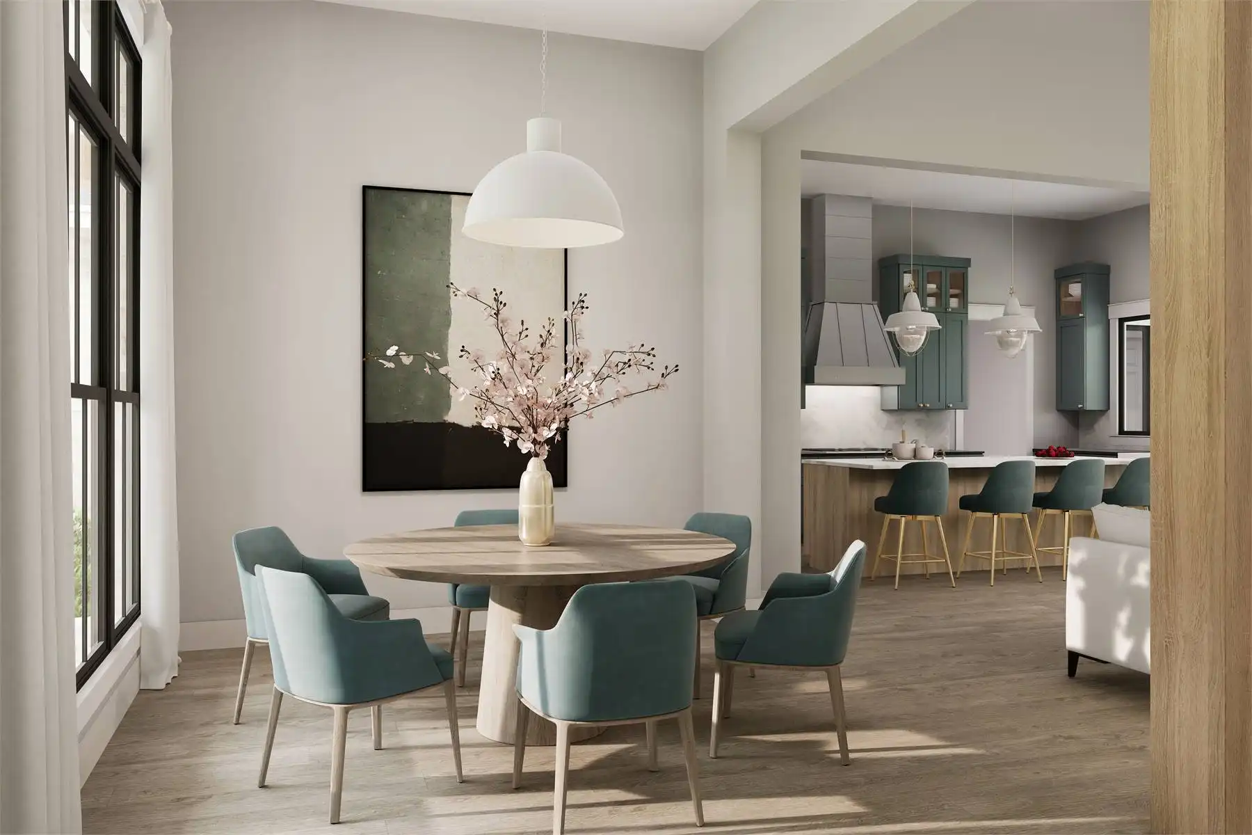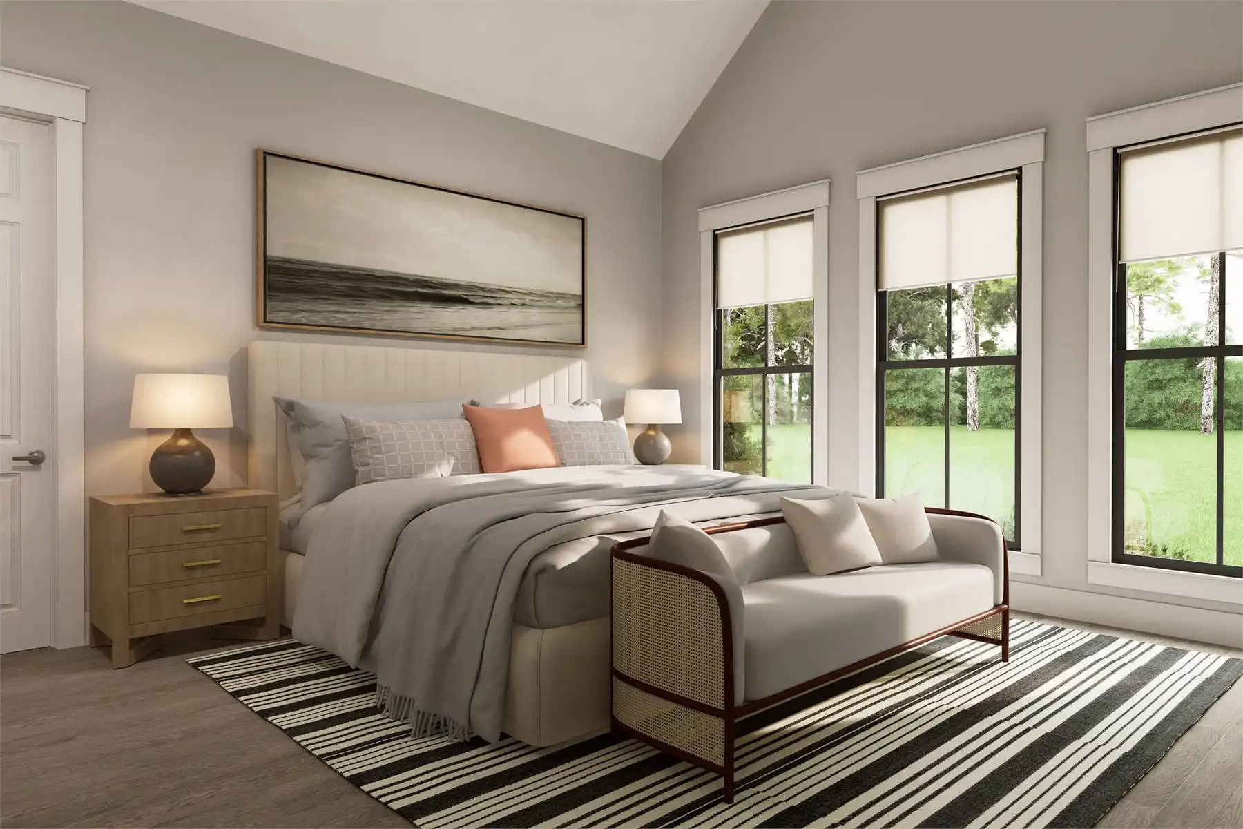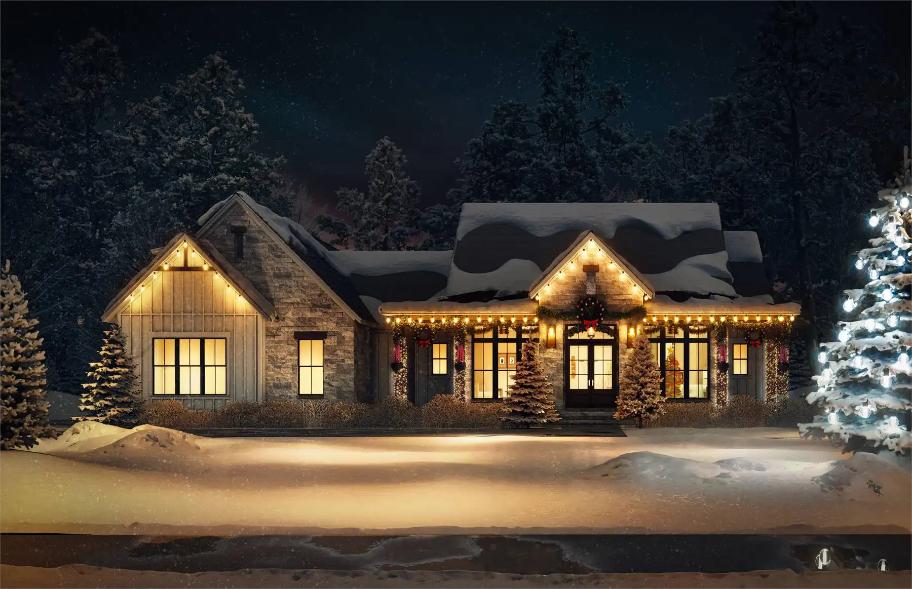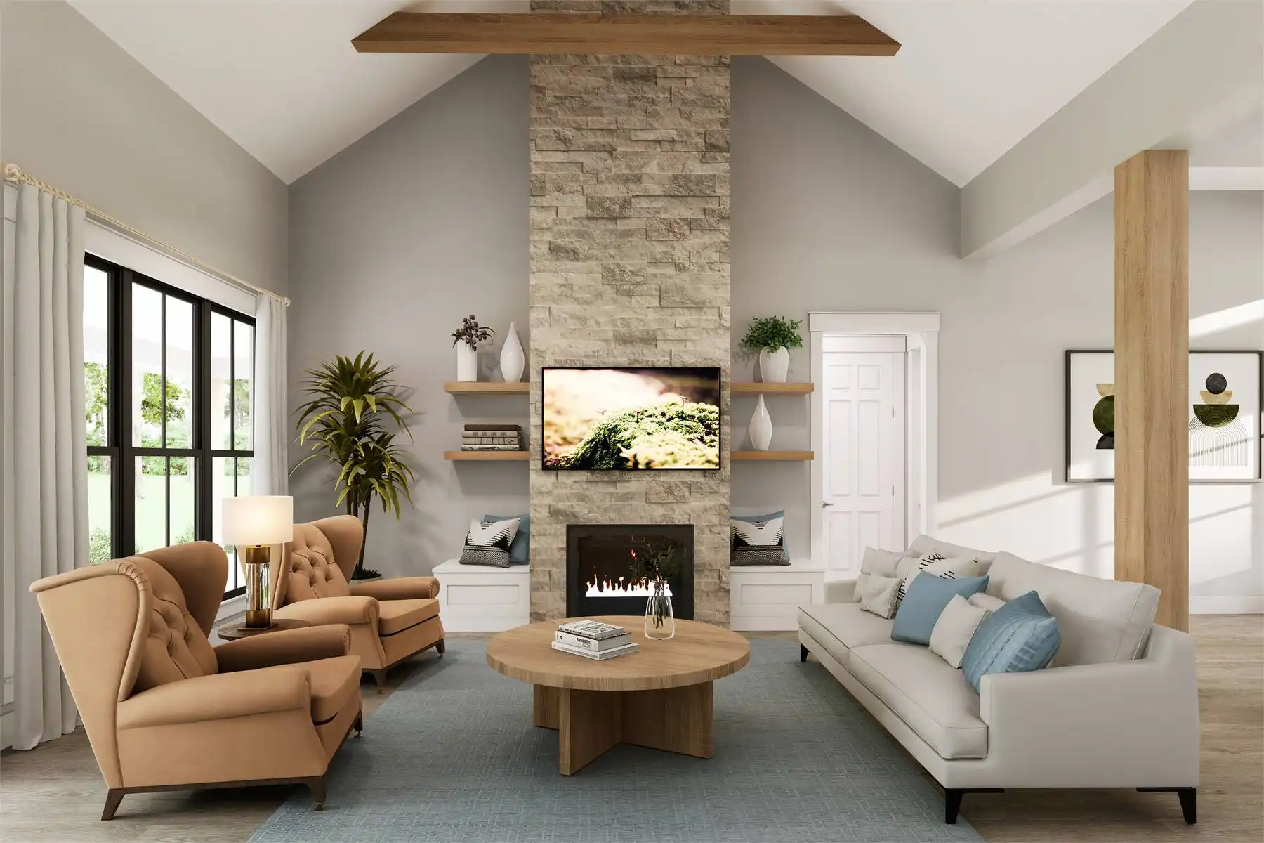Explore the charm of country living with House Plan 9291, a modern cottage where thoughtful design meets timeless appeal. The exterior blends stone and board-and-batten siding for an inviting, elegant look. Inside, the open-concept great room, dining area, and kitchen feature a vaulted ceiling with exposed decorative beams, perfect for family living and entertaining. This home includes three spacious bedrooms and three and a half baths, with the main suite offering a vaulted ceiling, luxurious bath, and a generously sized closet accessible through the laundry room. Enjoy the outdoors from the semi wrap-around porch and customize the versatile bonus room to suit your family's needs. Experience the ideal combination of style and functionality in this modern farmhouse, crafted for those who love to entertain and appreciate fine details.