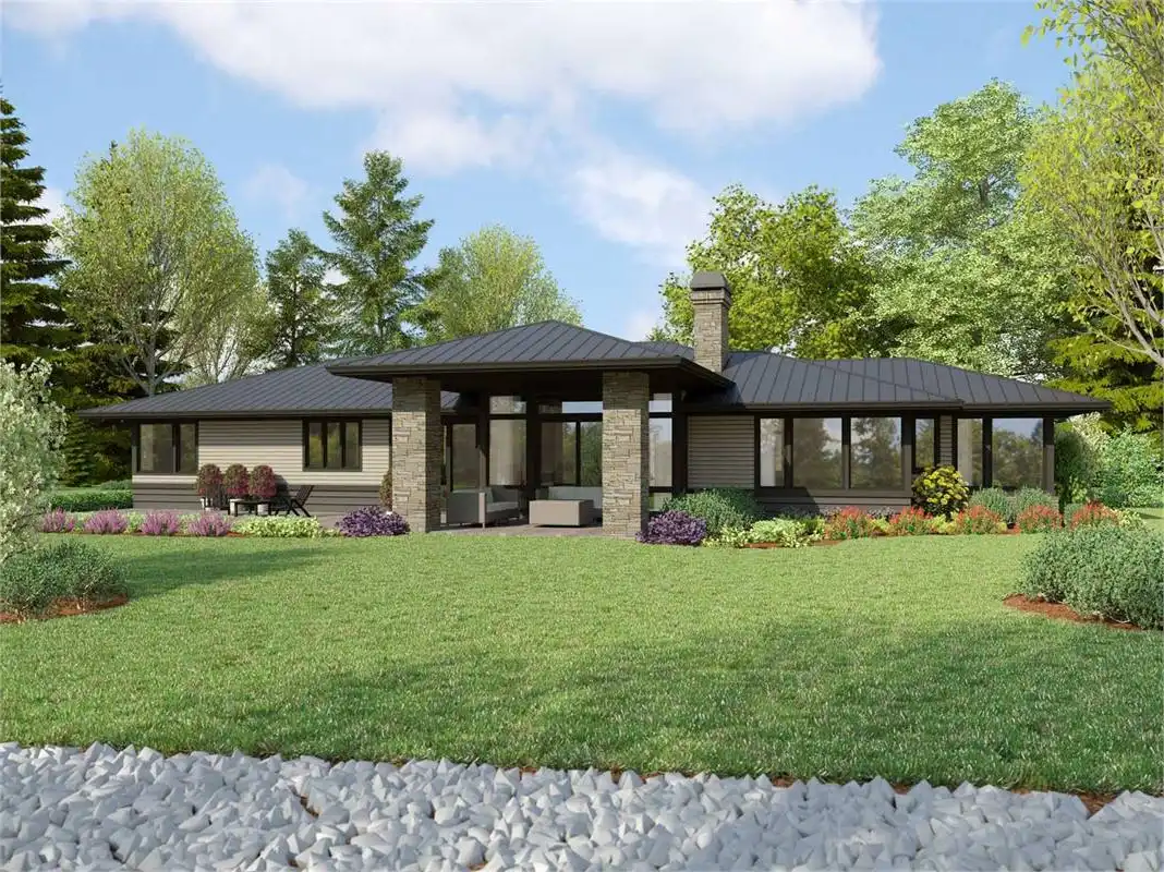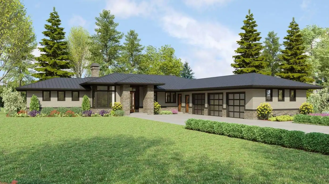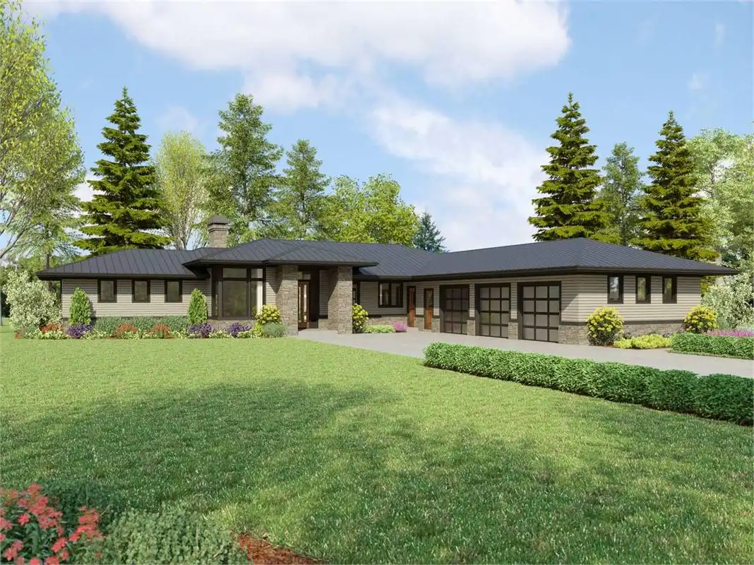 If you like mid-century design, House Plan 9293 is here for your consideration! This spacious ranch offers 2,911 square feet, four bedrooms, and three bedrooms along with a three-car garage. The floor plan places the open great room for views in back. Check out that U-shaped island kitchen, dining space with a buffet, and indoor-outdoor connection! Travel along the gallery hallway to access this and all the other areas in the home. The primary suite and a den/bedroom shore up one end while a pair of Jack-and-Jill bedrooms are on the other. In the middle is the great room on one side and a full hall bath and a huge utility room that connects to the garage. Make sure to look closely so you can appreciate all it has to offer!
