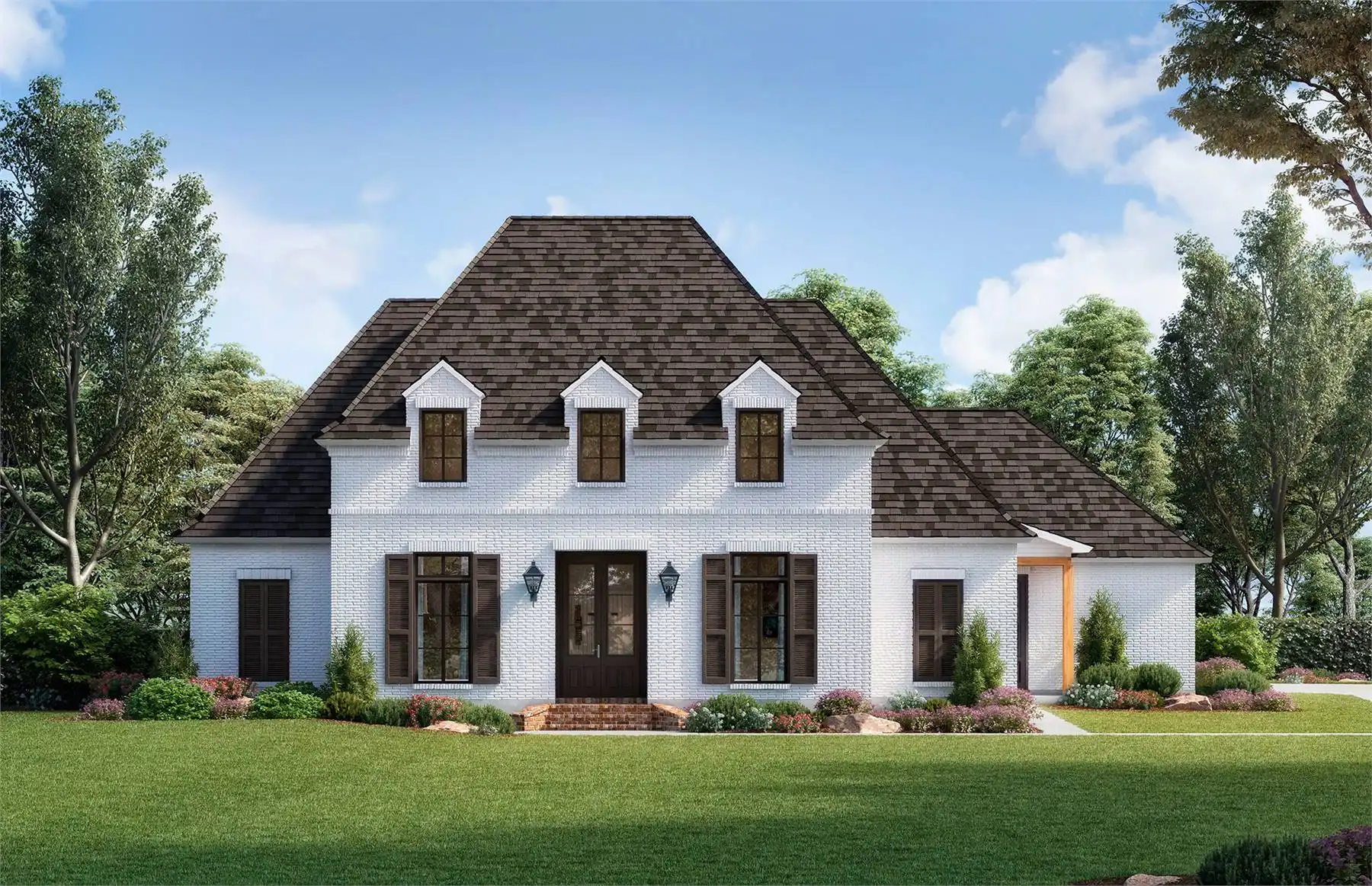 Discover the allure of this charming Southern Country house plan, offering 2,764 square feet of exquisite living space. This single-story home features four spacious bedrooms and three bathrooms, perfect for family living. The open-concept design includes a comfortable great room with a cozy fireplace and an L-shaped kitchen with a large island and bar seating, ideal for hosting. The primary suite provides privacy and a beautiful ensuite with a central soaking tub. Additional features include a large rear covered porch, a concrete patio, and a two-to-three-car carport with ample storage options.