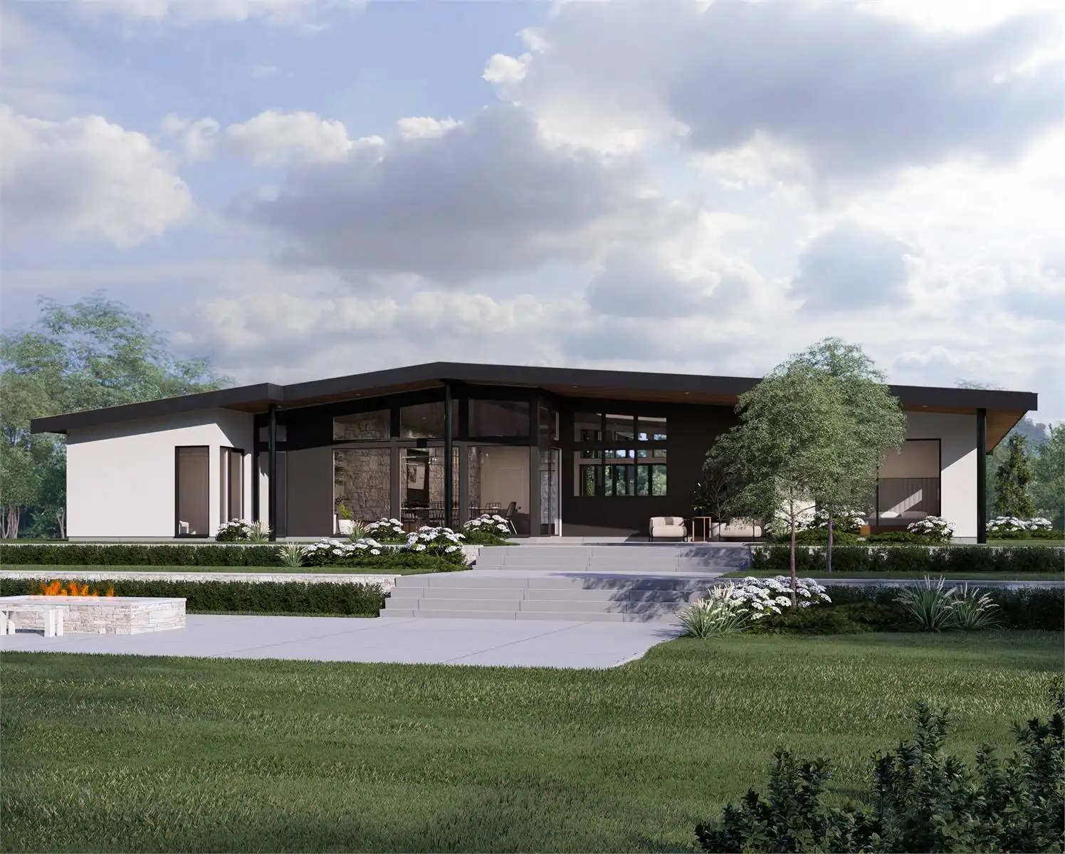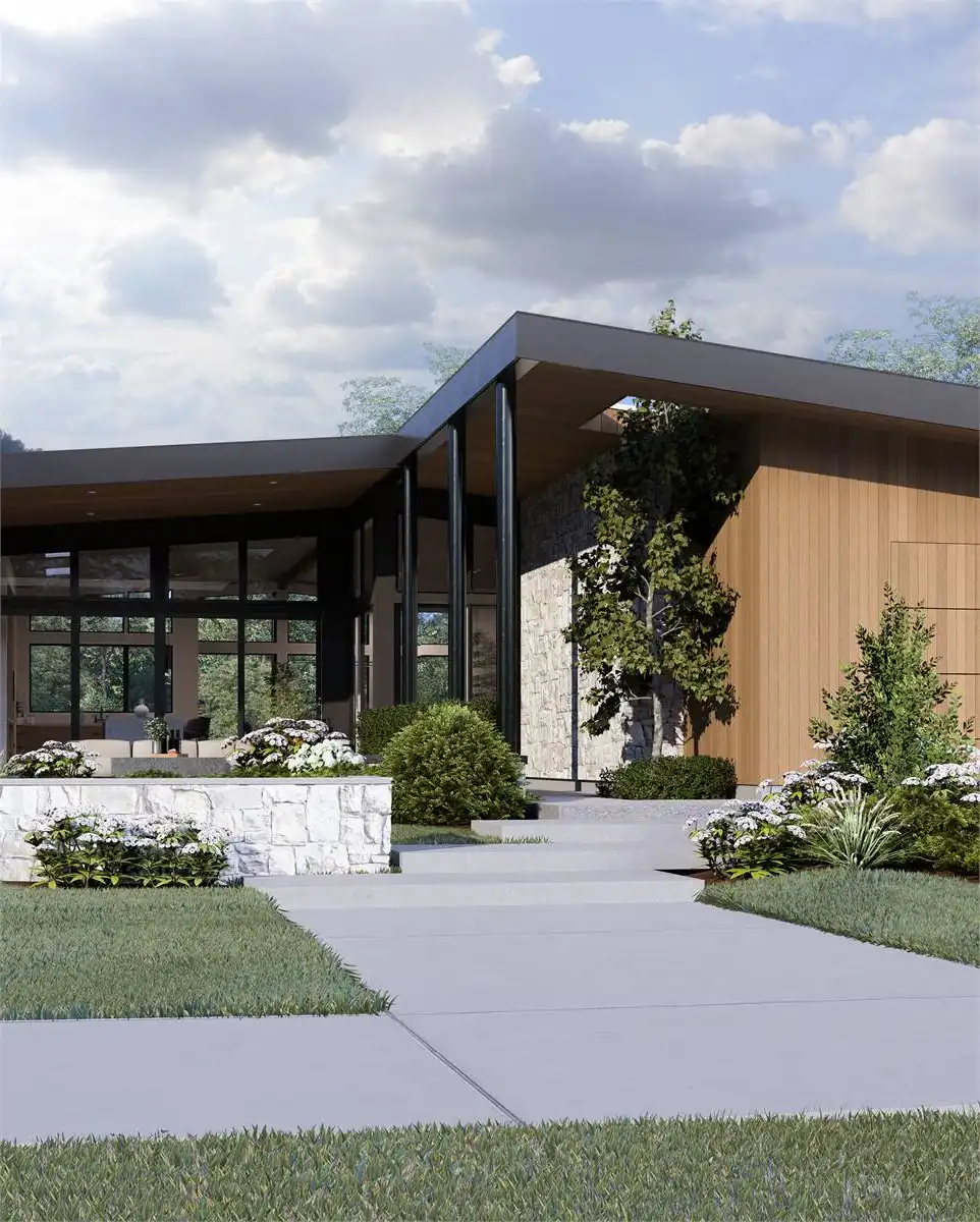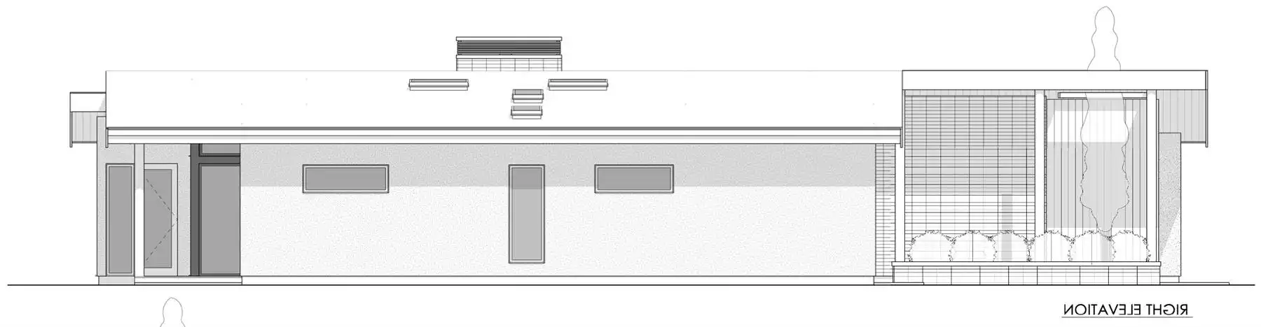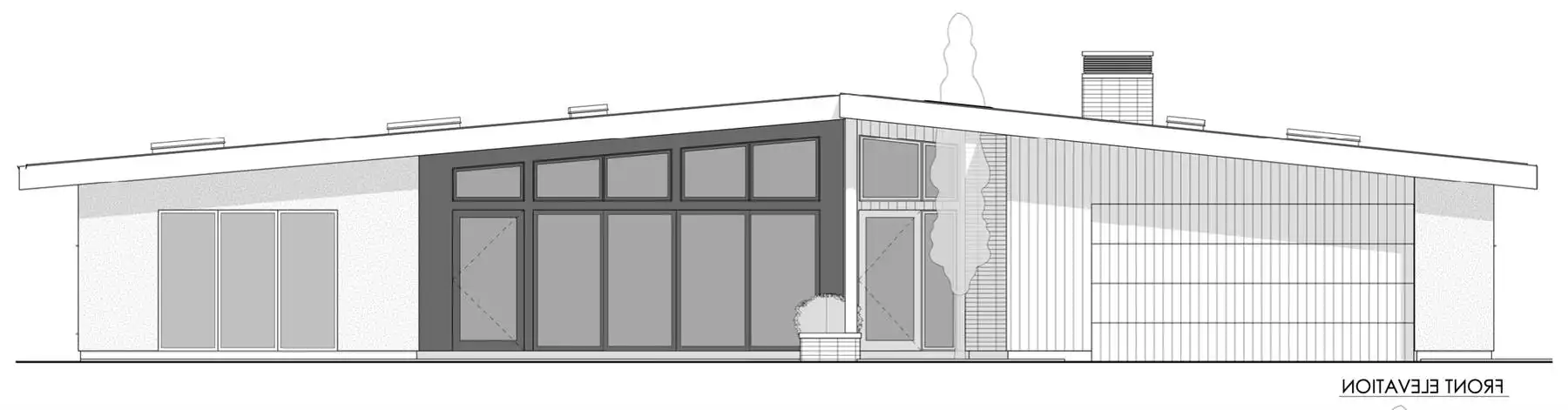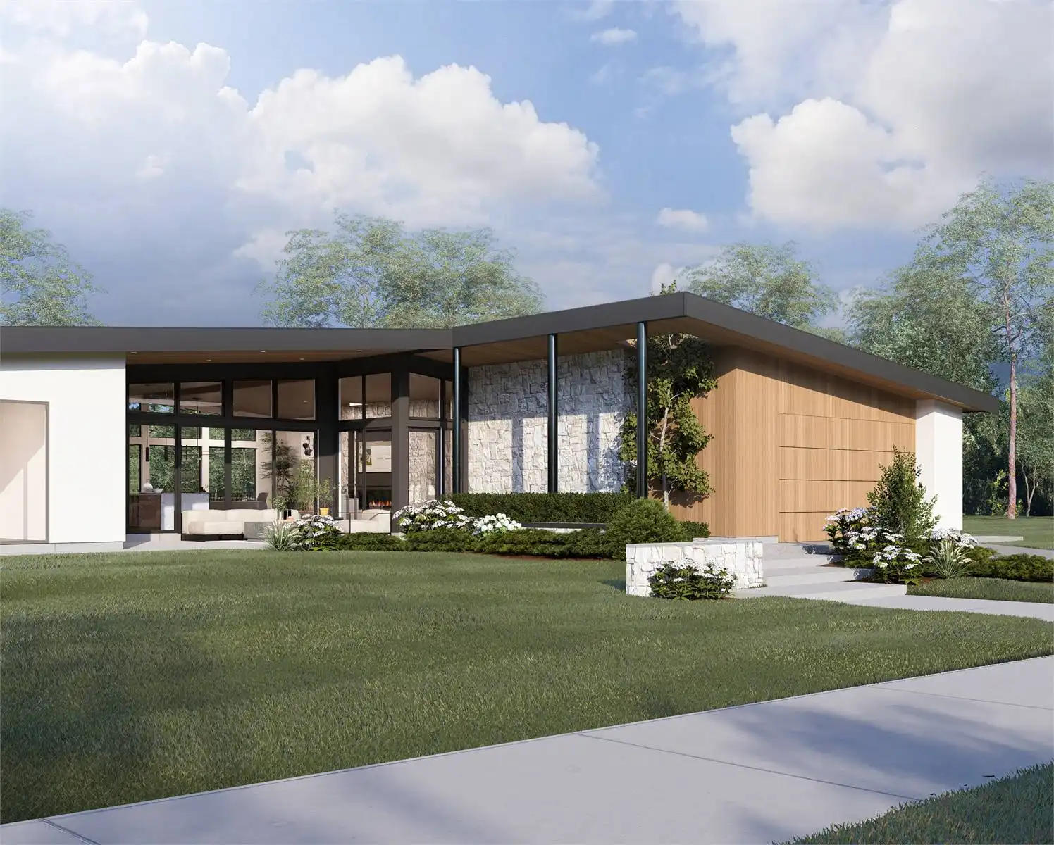 Welcome to House Plan 9333, a stunning 3-bedroom Contemporary home that beautifully blends style and comfort. With 3,118 square feet of space, this open-concept design maximizes natural light and spaciousness. The exterior features clean lines, a mix of materials, and floor-to-ceiling windows that seamlessly connect indoor and outdoor living. Inside, the expansive great room flows into the dining area and gourmet kitchen, complete with a large island with bar seating and ample storage. The primary suite, located in a split-bedroom layout on the right side of the home, offers a luxurious en-suite bathroom and a walk-in closet. Two additional bedrooms provide ample space for family or guests, and a versatile den adds flexibility to the floor plan. Outdoor living is enhanced by a covered patio with an outdoor kitchen, perfect for entertaining and enjoying the natural surroundings. House Plan 9333 masterfully combines mid-century aesthetics with modern conveniences, making it an ideal choice for those seeking a sophisticated and comfortable living space.