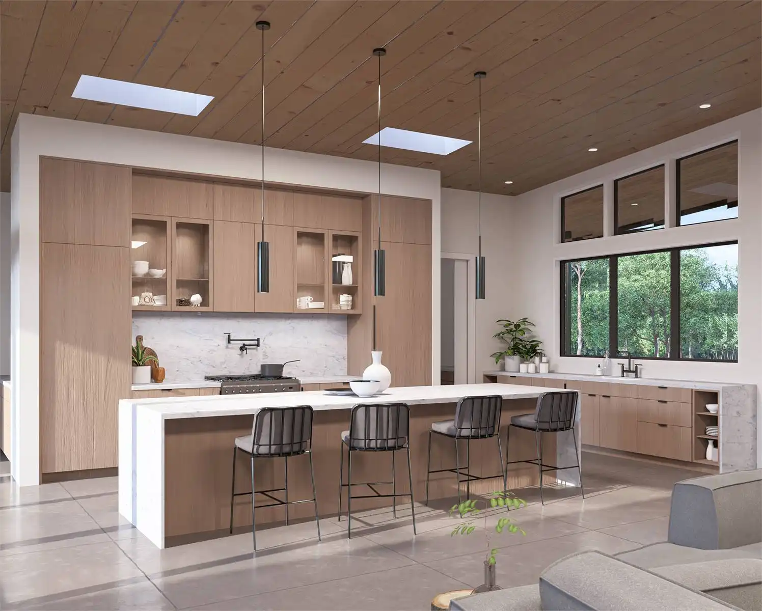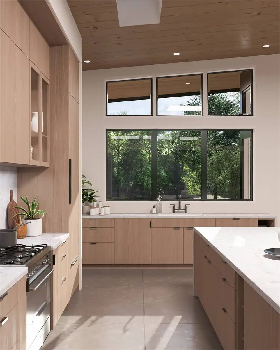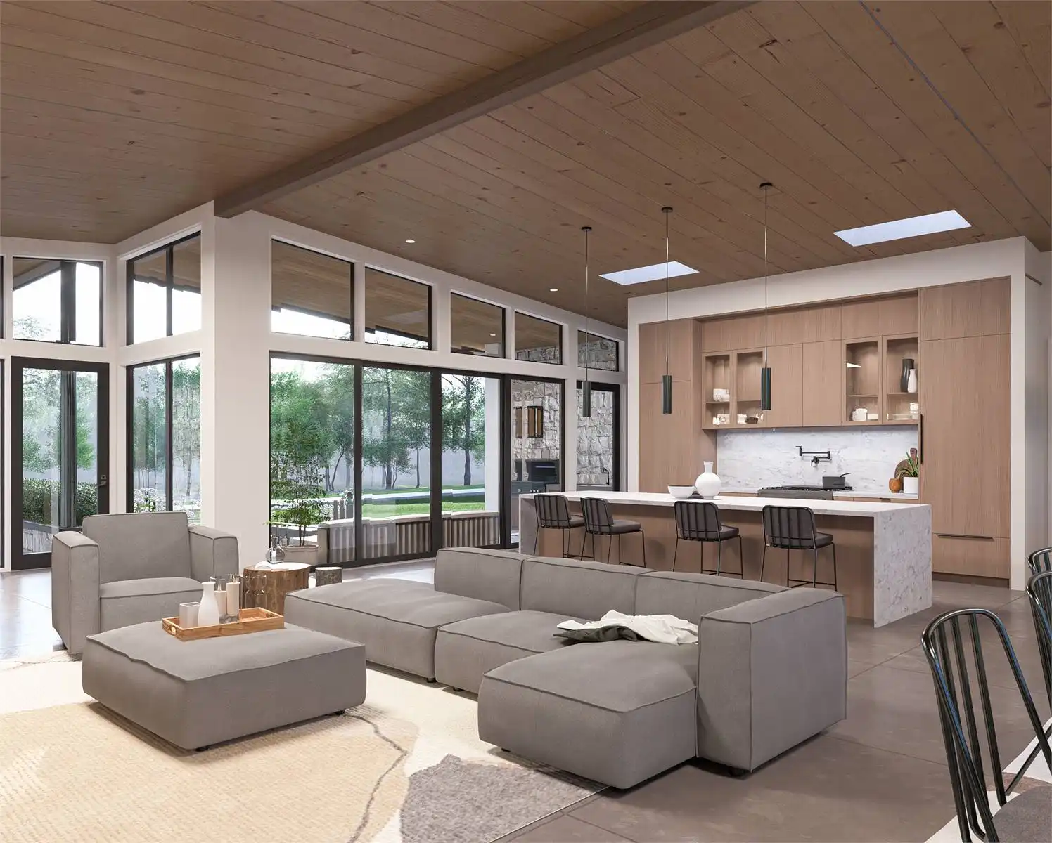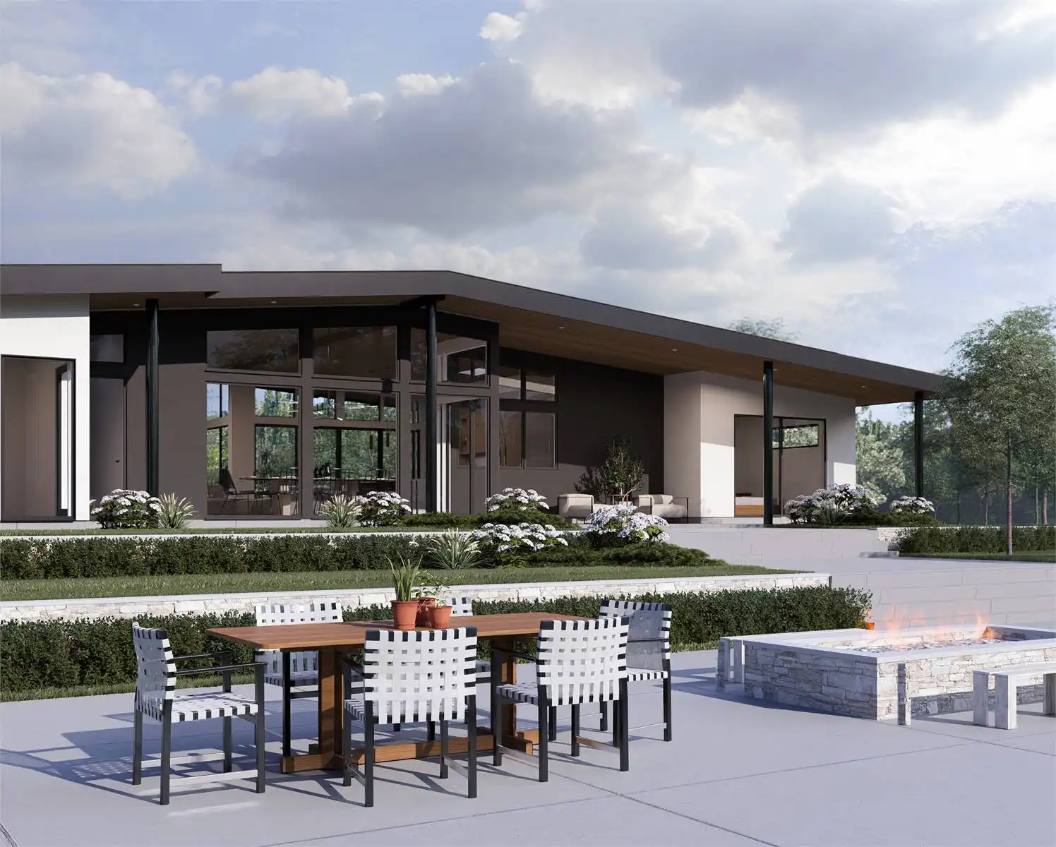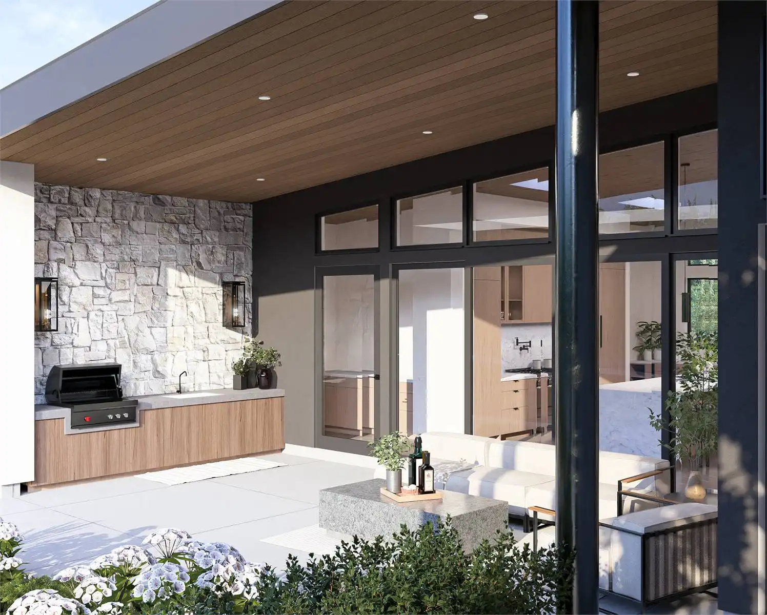 Welcome to House Plan 9333, a stunning 3-bedroom Contemporary home that beautifully blends style and comfort. With 3,118 square feet of space, this open-concept design maximizes natural light and spaciousness. The exterior features clean lines, a mix of materials, and floor-to-ceiling windows that seamlessly connect indoor and outdoor living. Inside, the expansive great room flows into the dining area and gourmet kitchen, complete with a large island with bar seating and ample storage. The primary suite, located in a split-bedroom layout on the right side of the home, offers a luxurious en-suite bathroom and a walk-in closet. Two additional bedrooms provide ample space for family or guests, and a versatile den adds flexibility to the floor plan. Outdoor living is enhanced by a covered patio with an outdoor kitchen, perfect for entertaining and enjoying the natural surroundings. House Plan 9333 masterfully combines mid-century aesthetics with modern conveniences, making it an ideal choice for those seeking a sophisticated and comfortable living space.