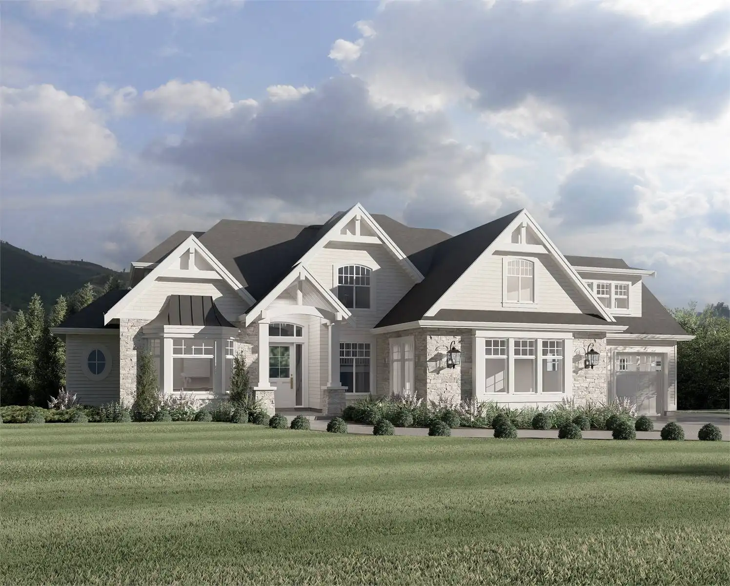 Introducing House Plan 9338, a stunning modern farmhouse that seamlessly combines contemporary sophistication with classic charm. Spanning 3,618 square feet, this home provides an ideal mix of comfort and style for families of all sizes. The open-concept design features a breathtaking great room with a vaulted ceiling open to the second floor above, a cozy fireplace, and expansive windows that bathe the space in natural light. The gourmet kitchen, equipped with a walk-in pantry and a spacious center island, is perfect for both daily meals and entertaining guests. The luxurious primary suite on the main floor offers a spa-like bathroom with a separate soaker tub and shower, creating a serene retreat. Upstairs, three additional bedrooms and a versatile bonus room provide ample space for family and visitors. The covered front porch and rear deck extend the living area outdoors, making it perfect for relaxation and social gatherings.
