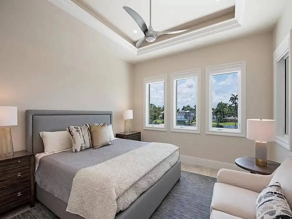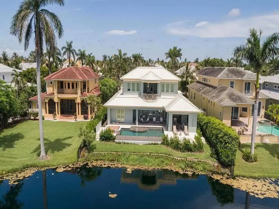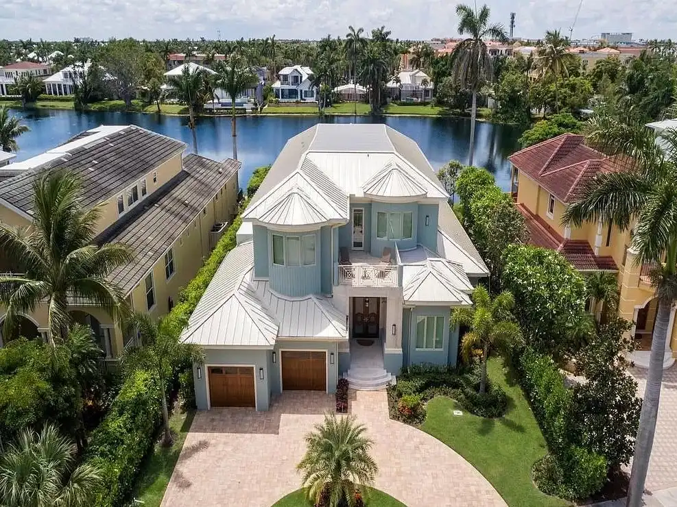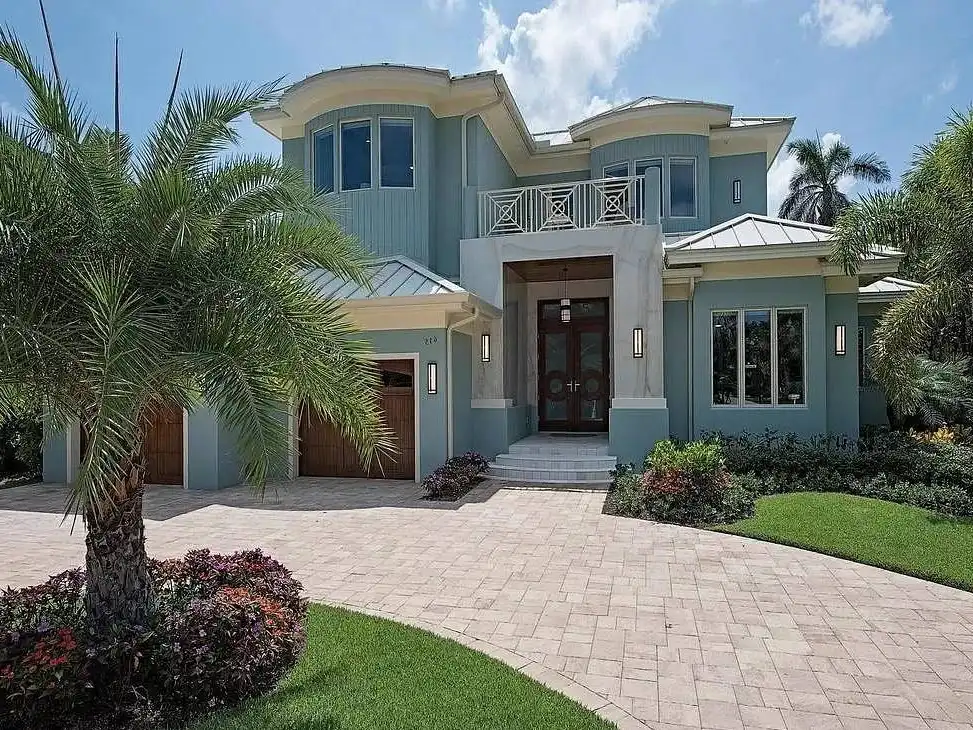Got a waterfront lot? See what House Plan 9349 has to offer! This 4,870-square-foot design boasts four bedrooms and five-and-a-half bathrooms across two stories. The first floor includes the three-car tandem garage, open-concept living, an absolutely luxurious primary suite with dual closets and bathrooms, a study off the foyer, spacious outdoor living, and even a dog run on the side. Upstairs, there are three more bedroom suites, a common lounge area, an exercise room, and two balconies. Look no further if you're in the market for a fully loaded beach house with room for the whole family!