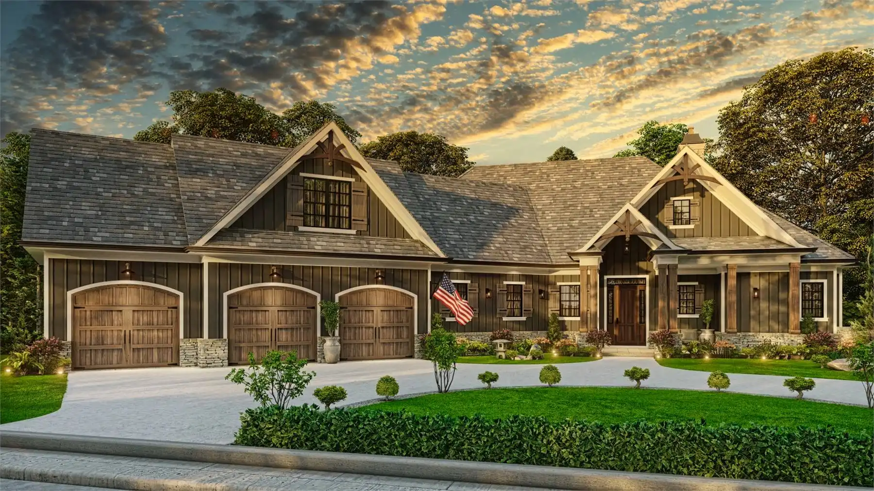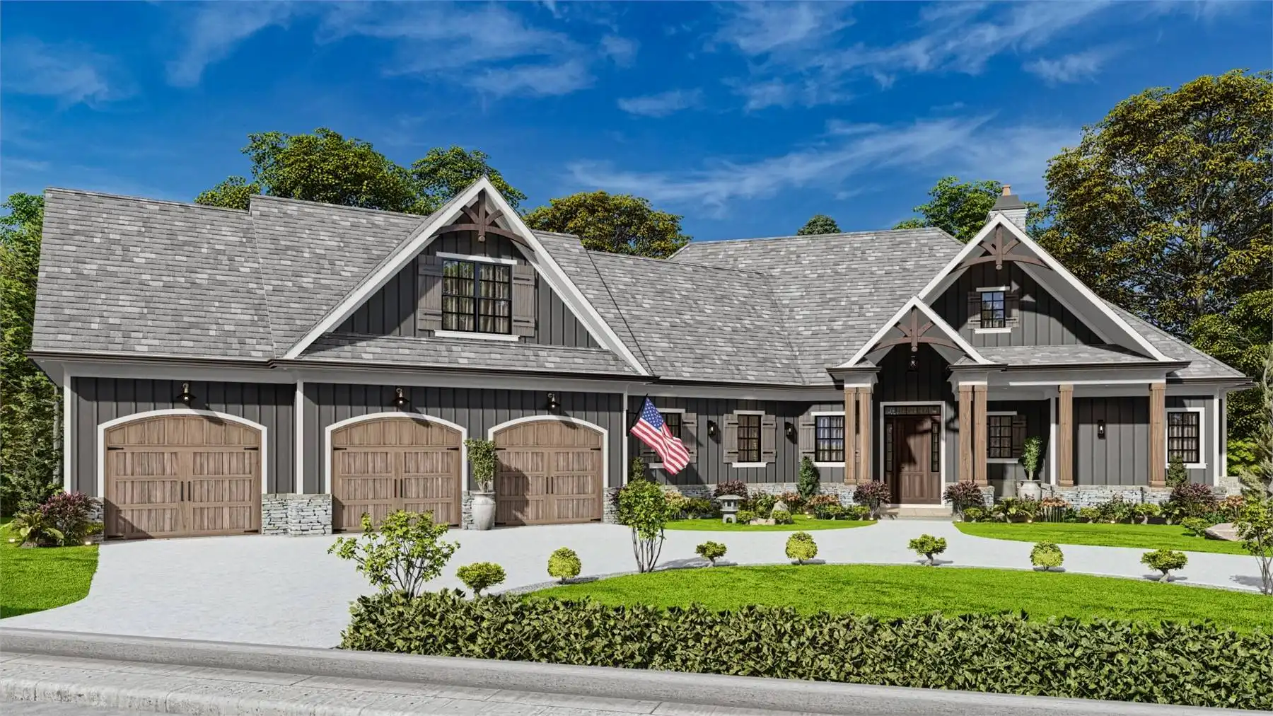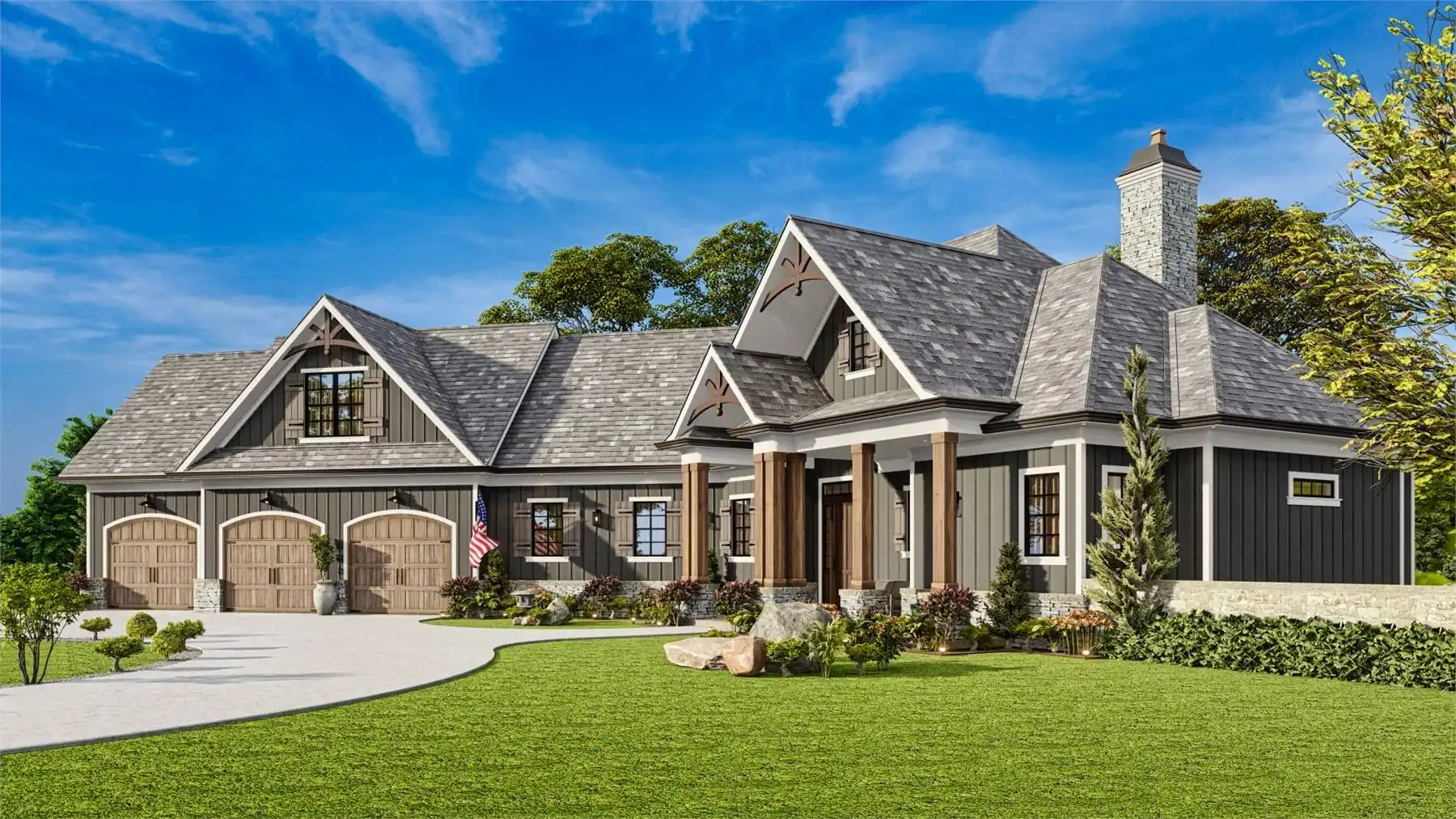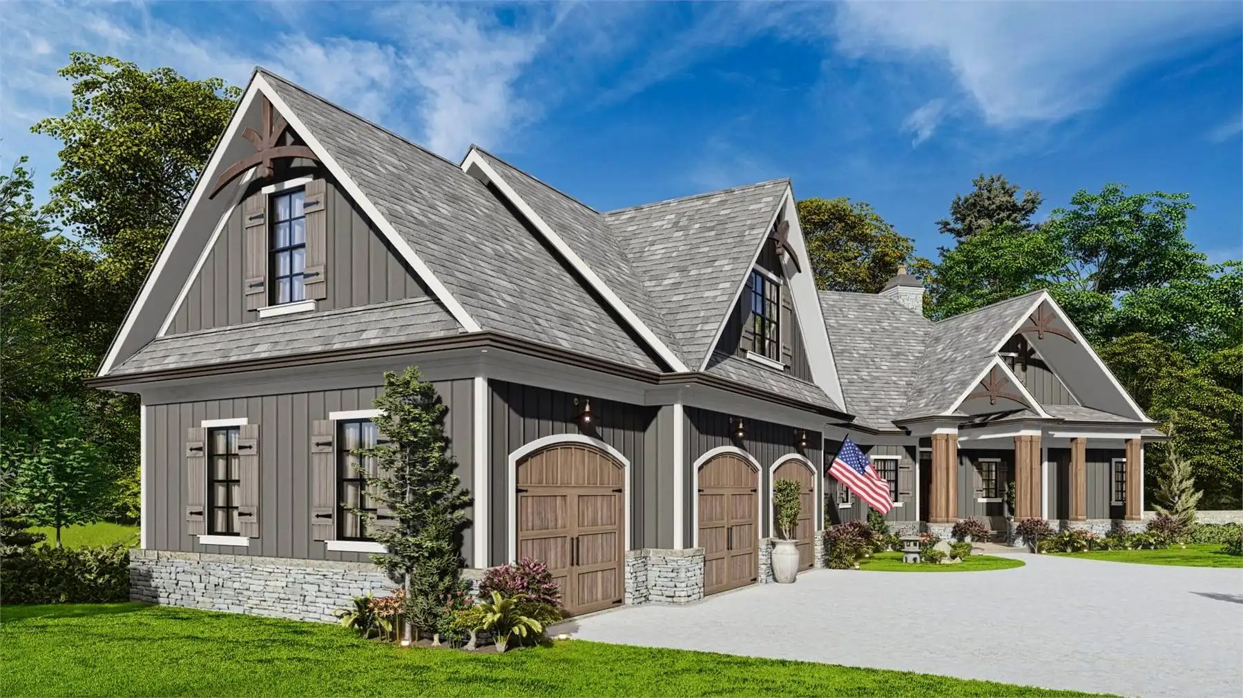 Welcome to House Plan 9356, a charming Craftsman home that perfectly balances elegance and functionality. This 3-bedroom, 2,243 square-foot home features classic Craftsman details like board and batten siding and timber accents, with a welcoming front porch. Inside, the spacious great room flows into the dining area and gourmet kitchen, which includes a large island, breakfast nook, and walk-in pantry, ideal for everyday living and entertaining. The main floor has a split bedroom design with a serene primary suite, luxurious en-suite bathroom, and large walk-in closet. Two additional bedrooms offer ample space for family or guests. There's also a versatile room that can serve as a formal dining room or home office. Optional finished basement and bonus room provide extra living space for a media room, home gym, or guest suite. Outdoor living is enhanced by a covered porch extending into the backyard, perfect for relaxation and gatherings.