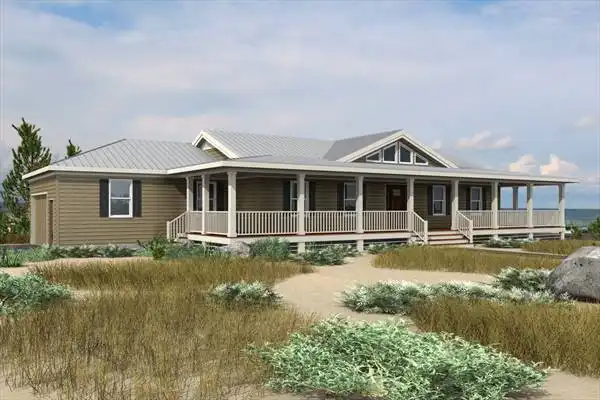 This beach vacation home has a large and beautiful covered front porch that wraps around most of the home where you can enjoy the coastal views with access on the side of the garage as well as the entry way. The two-car garage has a ramp and stairs with access to the mudroom, laundry room and half bathroom. The kitchen is open to the dining room with a peninsula counter. The living room with fireplace features a vaulted ceiling and stairs to the finished basement. This split bedroom plan has two bedrooms sharing a bathroom and the master is opposite with a walk in closet, dual sinks and is located in the front of the home. In the basement you find a mechanical room, a full bathroom, fireplace and a patio off the side.