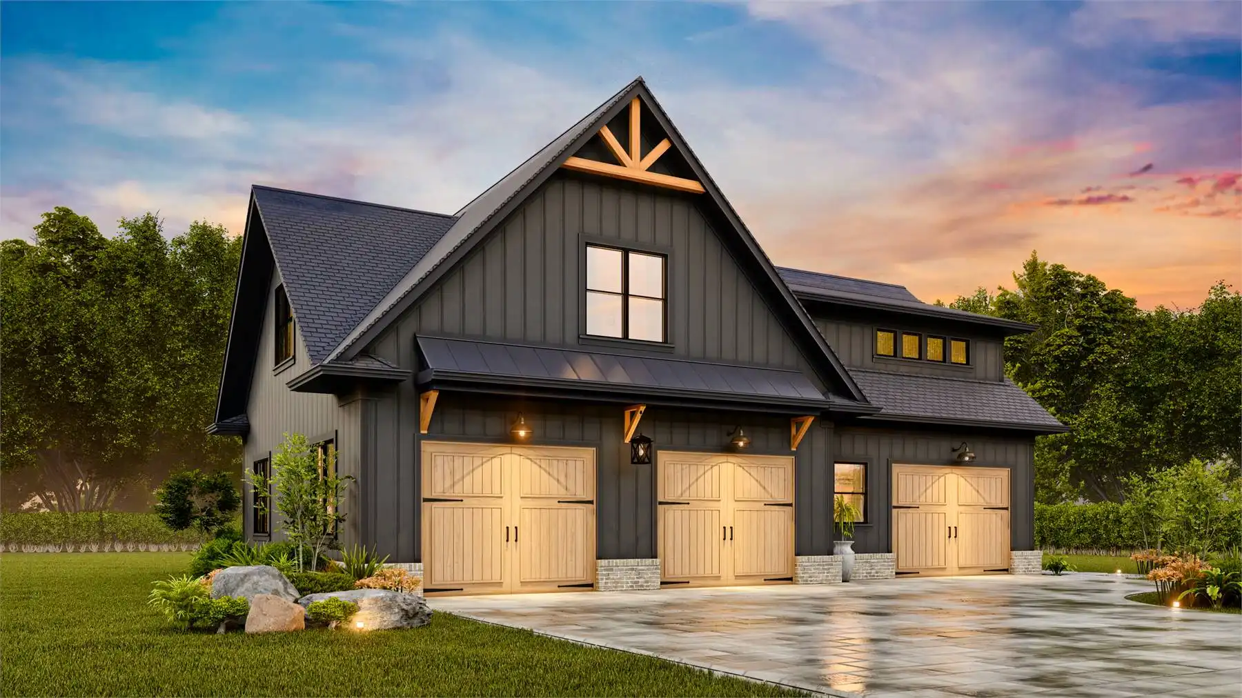 House Plan 9383 is a wonderful garage plus ADU that'll add tons more practicality to your property! This nifty design offers garage parking for two cars plus a golf cart. The vestibule for the apartment is tucked behind the golf cart bay and includes the laundry room. Head up the stairs and you'll find an island kitchen overlooking the living and dining space. There's also a bedroom and a bathroom--and the bathroom is accessible from the bedroom as well as the common area. What a thoughtful design totaling 1,544 square feet of finished space!