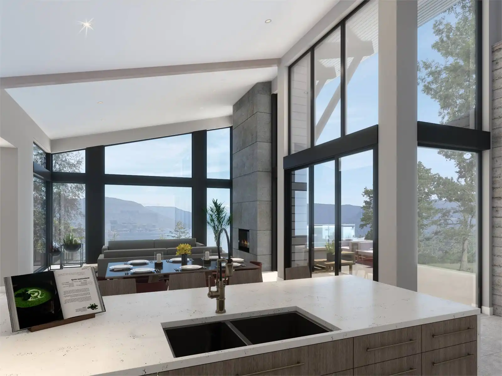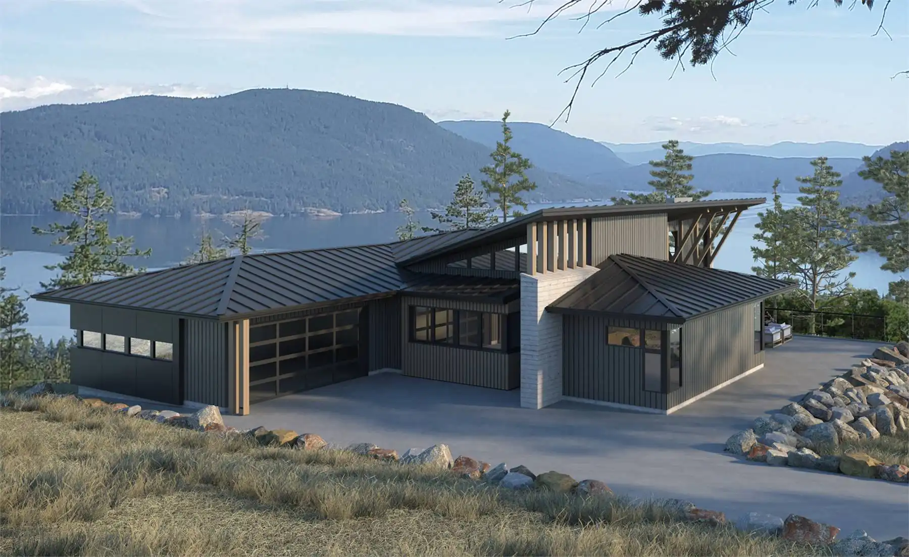 House Plan 9422 is a Contemporary design perfect for mountain views. Tall ceilings, oversized windows, and an open layout fill the home with natural light and connect the 9' by 4' island kitchen to a partially covered deck for seamless indoor-outdoor living. The main level features a primary suite with a walk-in closet and wet-room ensuite, a home office, entertainment room, and a mud hall with laundry and powder bath access. A double garage provides extra storage or workshop space. The lower level includes two guest suites with patio access and a coffee bar, offering a private retreat. Designed for functionality and breathtaking views, House Plan 9422 is mountain modern living at its finest.