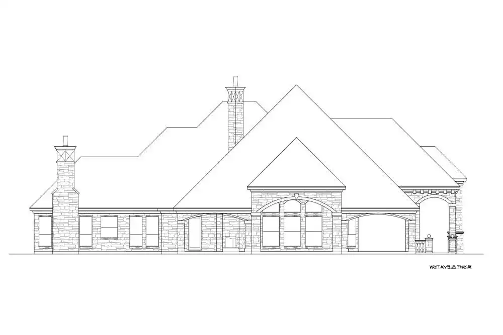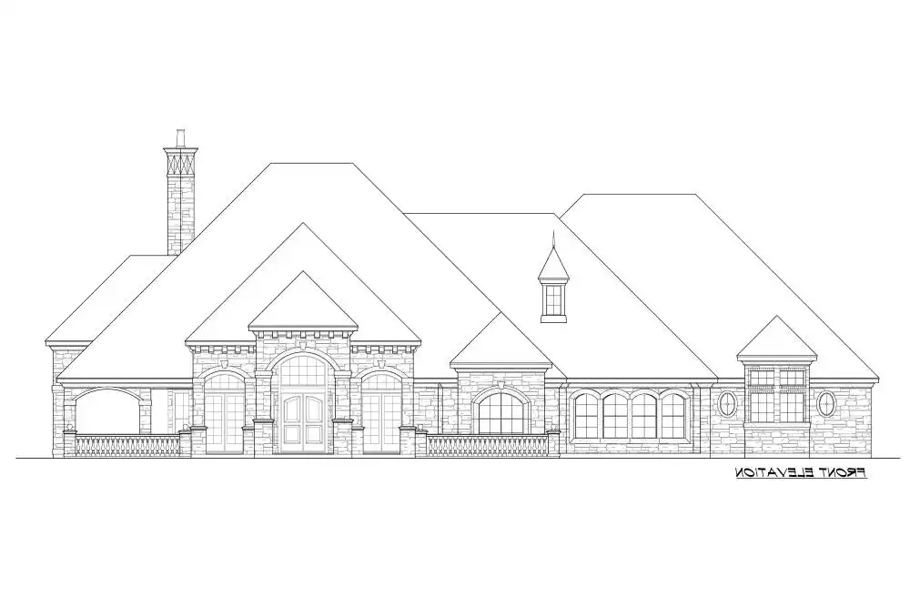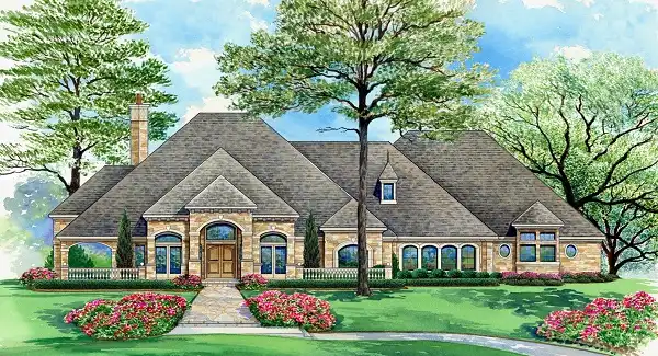 A European luxury mansion home plan combines everything you could need on one floor. Off the elegant foyer is a quiet study with beautiful details such as a coffered ceiling, built-ins and a cozy fireplace. Also found off the foyer is the formal dining room sitting adjacent to the bar and kitchen for ease in serving. The family room area consists of the kitchen, breakfast area and a corner fireplace, built-ins and large bank of windows. Enjoy the outdoor living area and the views that could come with the concept pool. Let the sun brighten you day with the rays shining through the large bank of windows. The gourmet kitchen offers a free-standing island for extra counter space, and a breakfast bar that can be shared with the family room and breakfast area. Two family bedrooms with walk-in closets and full baths sit quietly in the rear of the home near the three-car rear entry garage with built-ins and many storage closets. A guest suite with walk-in closet and full bath sits quietly between the master suite and dining room. The luxurious master suite boasts a bay window, trey ceiling, lavish master bath with his and hers vanities, separate shower, whirlpool, and his and hers wardrobes with a built-in cedar closet. Beyond the bedrooms, a game room sits in the rear of the home. This completes this European luxury mansion house plan.