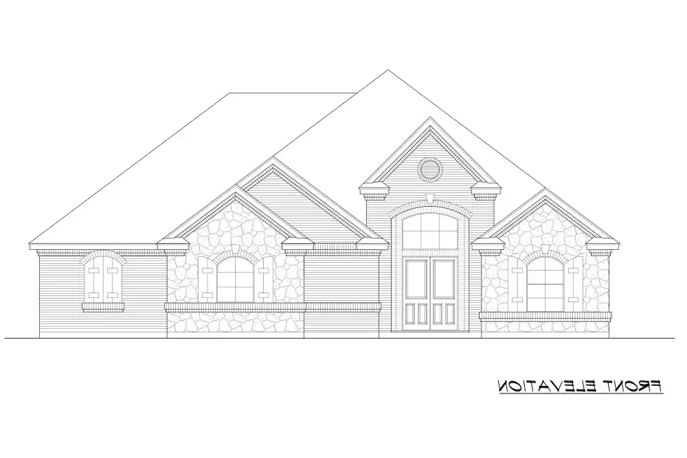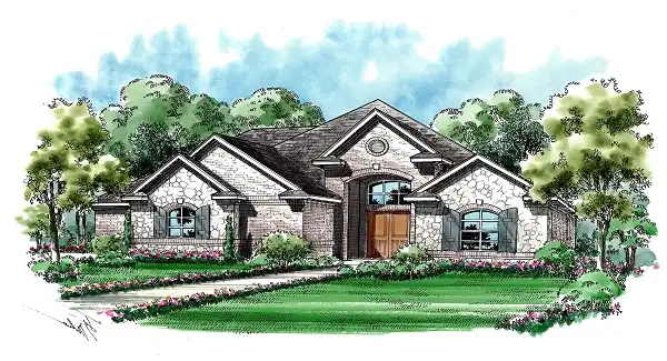 This luxury home has everything you need on just one floor. Enter through the stunning private front porch to the foyer. The study features an octagonal trey ceiling. Beyond the foyer is the formal dining with large decorative pillars that define its perimeters and a bar. The butlery between kitchen and dining room make serving an easy process. The family room, kitchen and breakfast area are all open to one another, separated only by the breakfast bar. A free-standing island offers additional counter space. The large bank of windows in the family room and breakfast area allow sun to stream through. Two family bedrooms with walk-in closets share a Jack and Jill bath. The luxurious master suite boasts a bay window, trey ceiling, lavish master bath with his and hers vanities, separate shower, tub, and a large wardrobe. Two garages, a one-car and a two-car complete this luxury house plan.