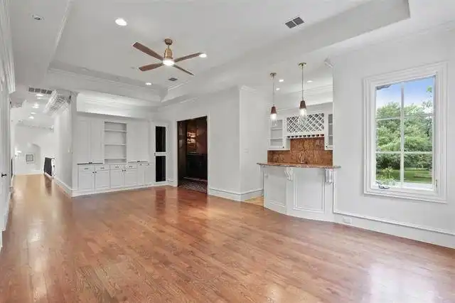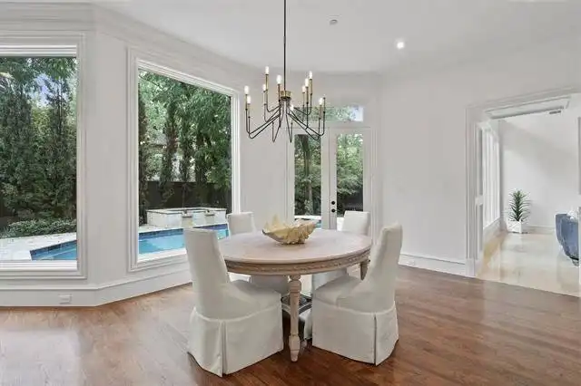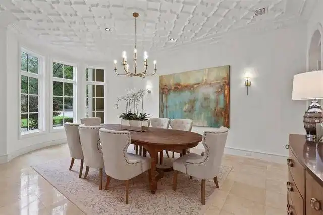 shines through; and an elegant dining room with bay windows, large ornately decorated pillars