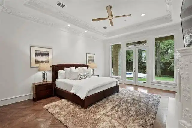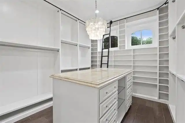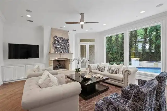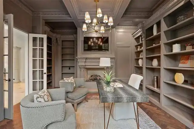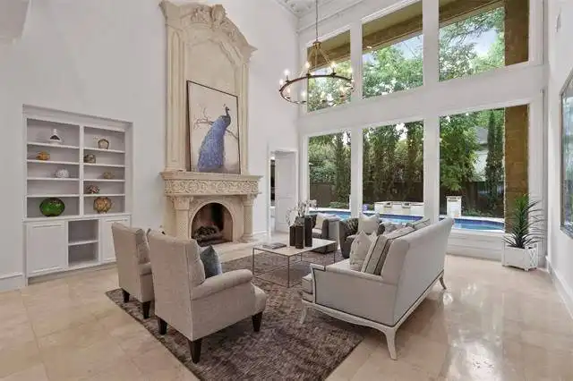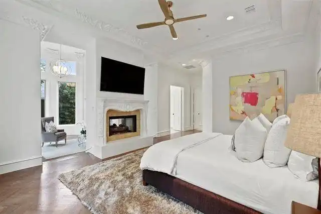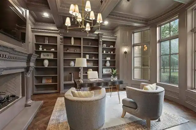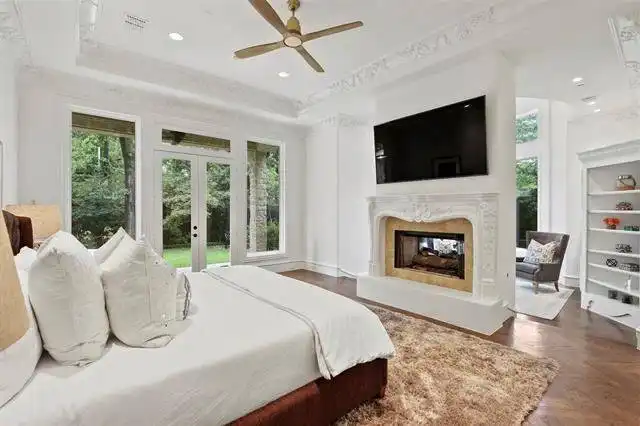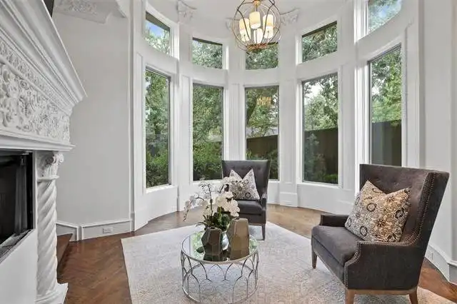 boasts a circular sitting room with bay windows, storage space, a two-sided fireplace, and a