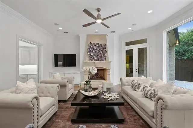 fireplaces and crown molding throughout. Entry through the two-story covered entry into the grand