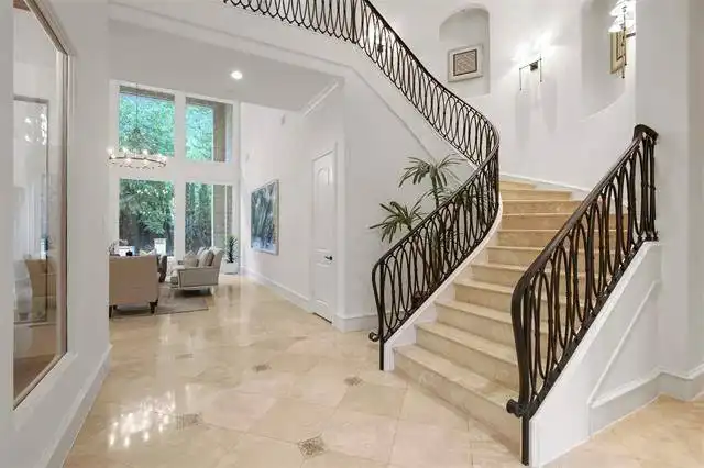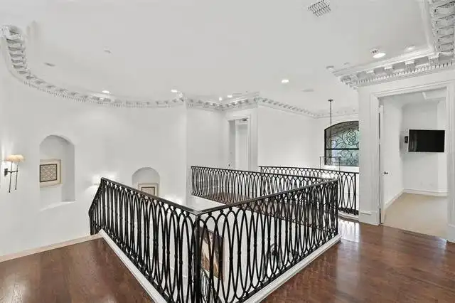 wrought iron staircase that leads you to the second story of this luxury floor plan. On either side