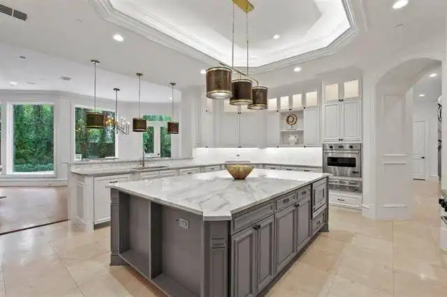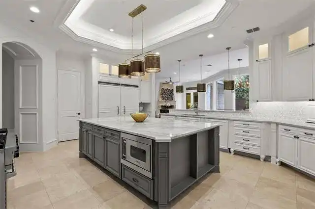 in microwave, oven, refrigerator, and two dishwashers. A free standing island in the kitchen has a