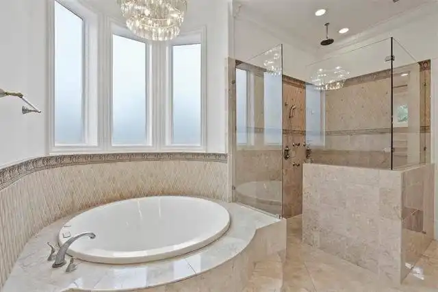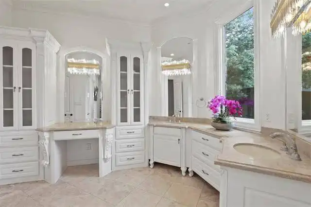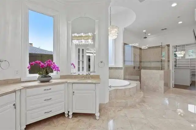 luxurious master bath with his and hers vanities, a circular tub that sits at a bay window, a