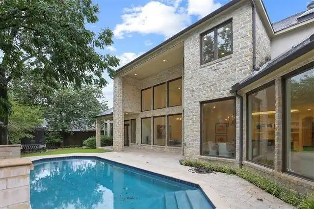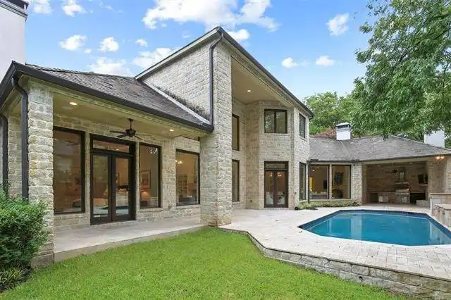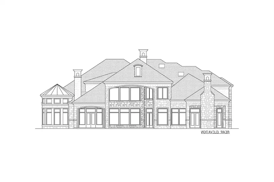 roof details, and coach lights and bay windows. While the elegant two story covered entry says Versailles, the back of the home radiates a different, more contemporary feel. Ornate designs flock large decorative pillars,