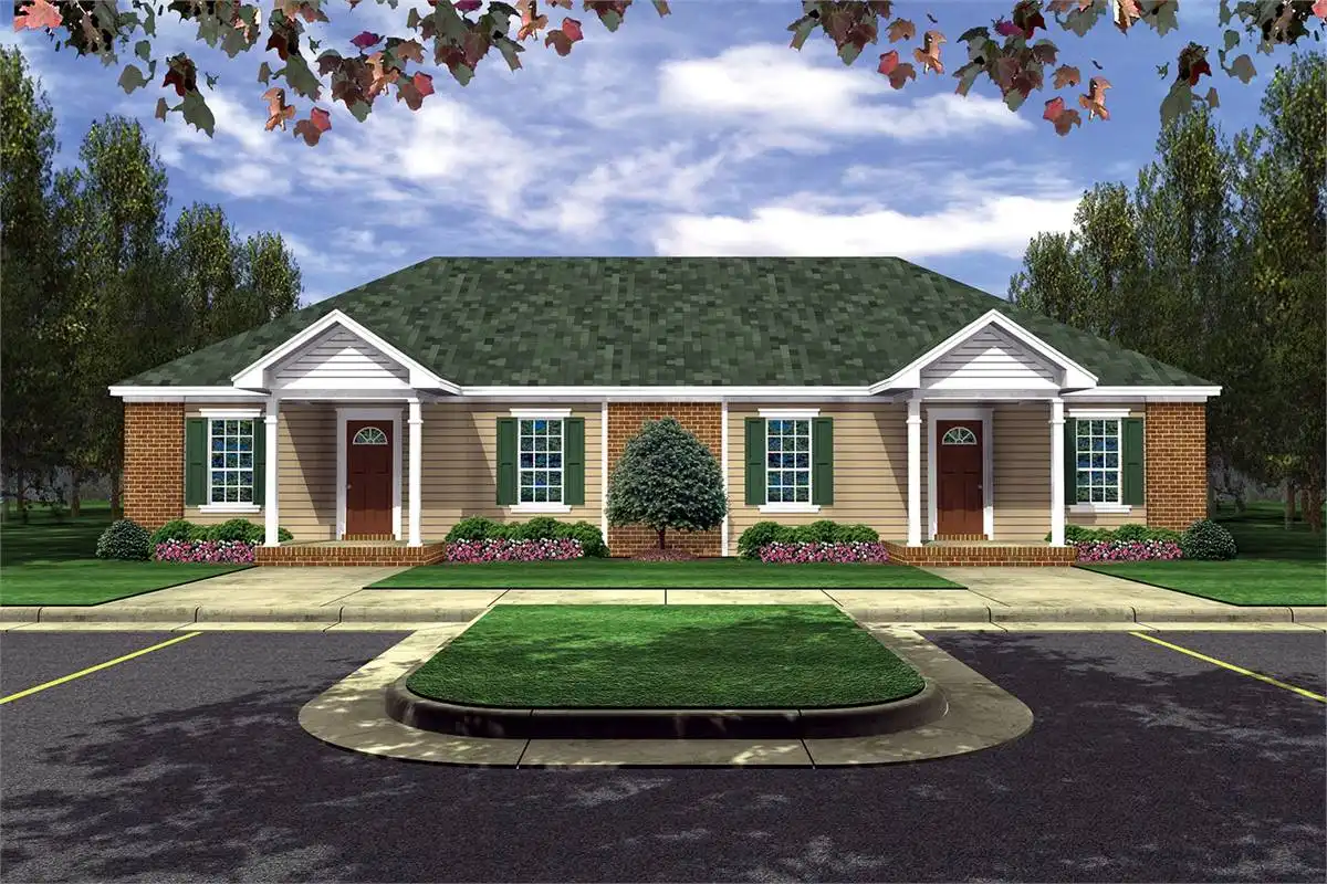 Simple to build and value strong Duplex plan. Extremely efficient layout and design maximizes value per square foot, and has several features which help to minimize the overall cost-to-build, including the shape of the building, hip roof, and 8 ft. ceiling heights. Other unique features of this home design include: highly-effective use of space for 701 square feet (2 bedrooms, 1 bath); large master suite with two closets, patio for grilling, covered front porch, and great street appeal. A winner for both builders and owners!
