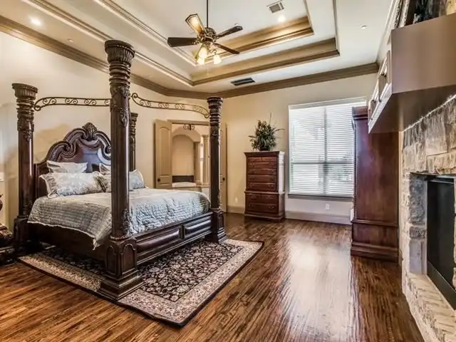 suite features a corner fireplace and trey ceilings. The master bath offers a separate shower and