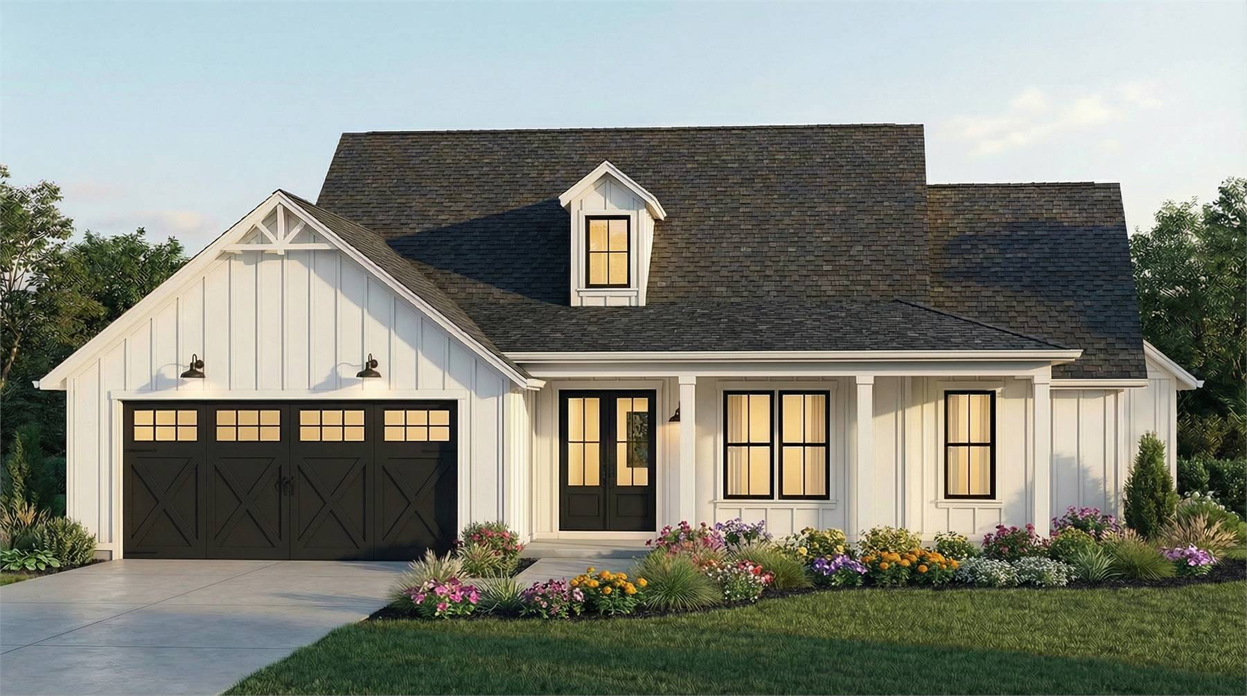 This beautiful affordable farmhouse floor plan featuring 1,600 s.f. makes for a great first home. Lovely and welcoming, this house has wonderful curb appeal. The front, wraparound porch gives plenty of space for rocking chairs or even a porch swing. Split bedrooms and an open plan plan with L-shaped kitchen, dining room and great room make for a perfect place for entertaining and family time. The master bedroom with ensuite bath is peaceful and relaxing. Enjoy outside activities on the covered porches and convenience of 2-car front entry garage.
