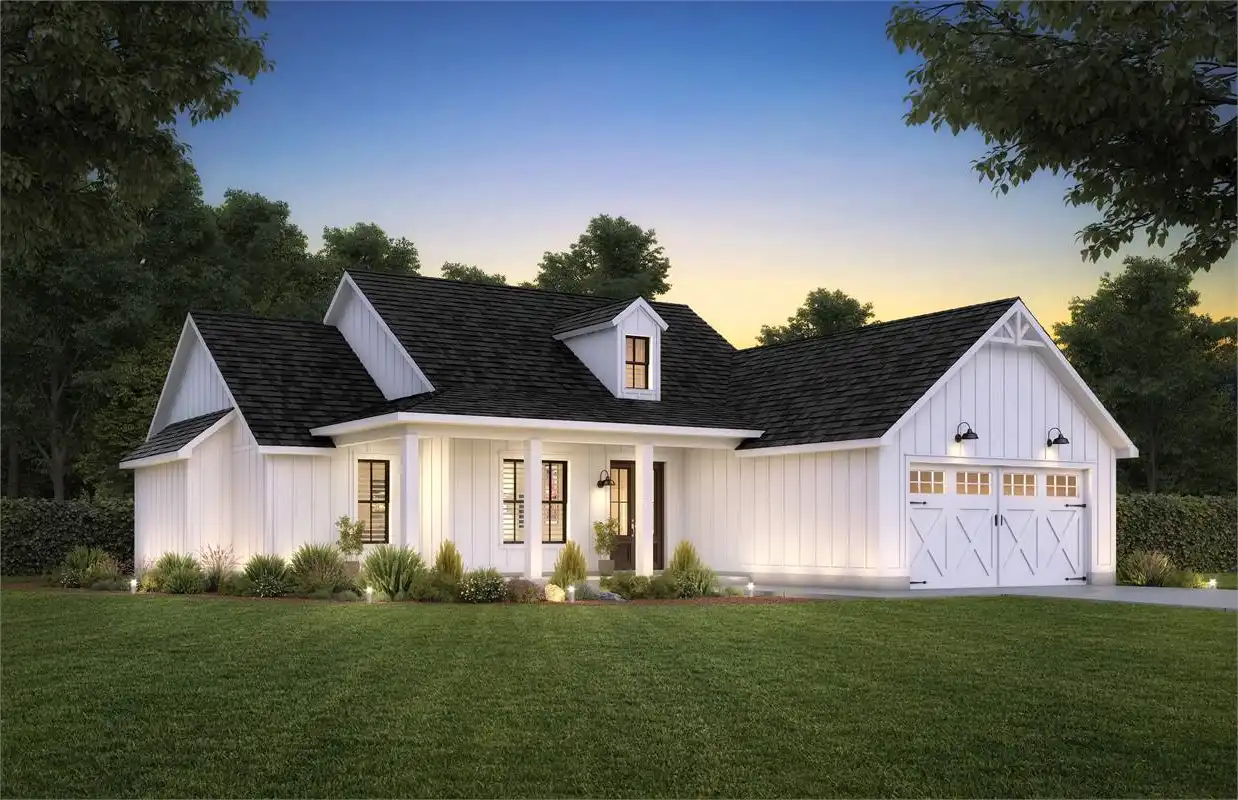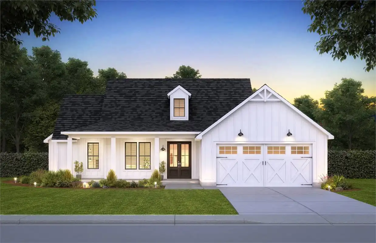 This beautiful affordable farmhouse floor plan featuring 1,600 s.f. makes for a great first home. Lovely and welcoming, this house has wonderful curb appeal. The front, wraparound porch gives plenty of space for rocking chairs or even a porch swing. Split bedrooms and an open plan plan with L-shaped kitchen, dining room and great room make for a perfect place for entertaining and family time. The master bedroom with ensuite bath is peaceful and relaxing. Enjoy outside activities on the covered porches and convenience of 2-car front entry garage.