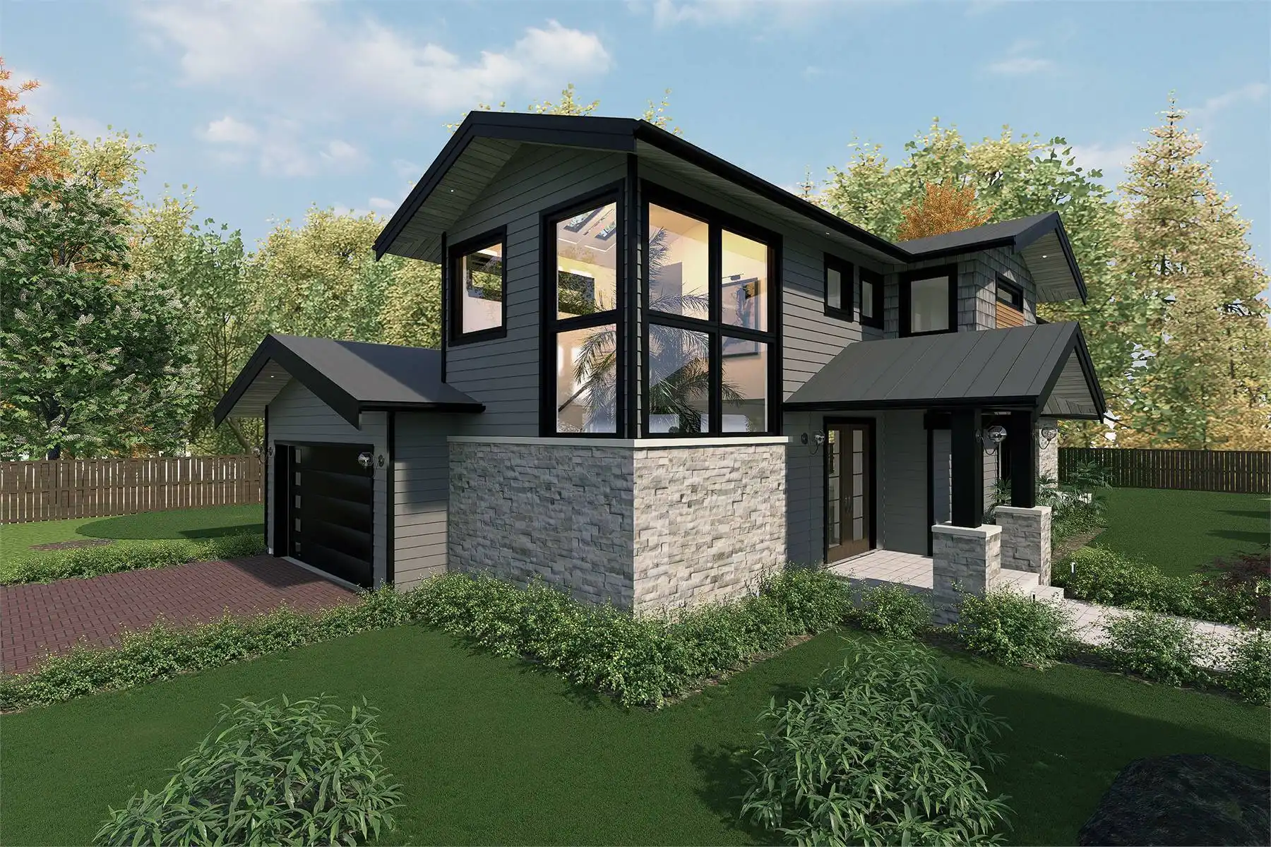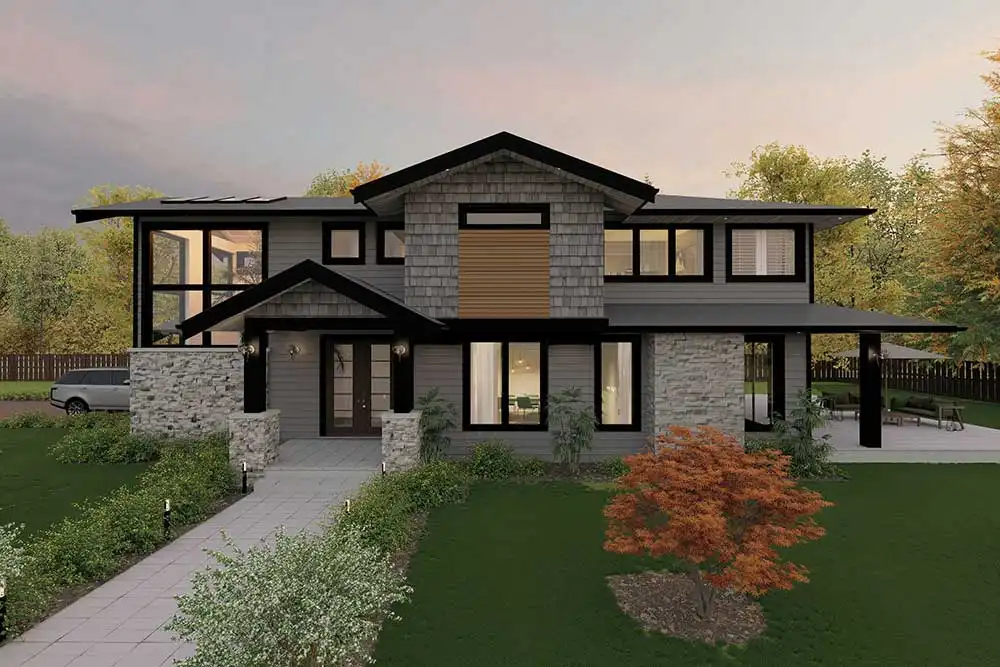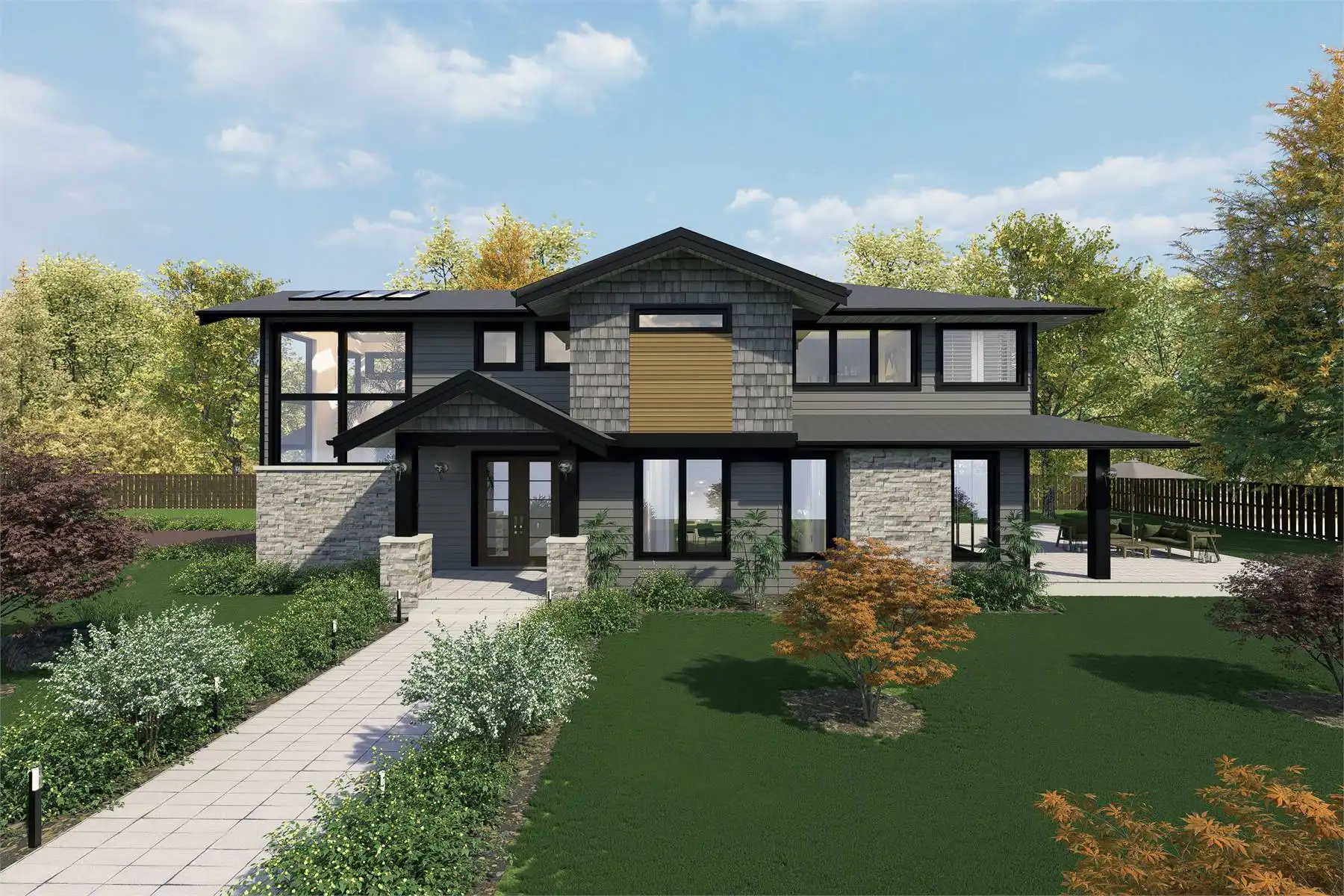 Looking for a home with architecture inspired by the style of the Pacific Northwest? House Plan 9492 is here for your consideration! This 3,040-square-foot, four-bedroom, three-and-a-half-bathroom design offers rustic transitional style and a mixed layout that will appeal to contemporary and traditional tastes. The first floor includes totally open-concept living with a U-shaped kitchen, a powder room, and a mudroom that connects to the side-entry garage. There's also a spacious covered patio on the side. The two-story atrium with the stairs leads up to all four bedrooms. There's a primary suite, a smaller suite ideal for guests, and two bedrooms that share a hall bath for the kids. With plenty of windows all around this home, it would make a great choice for a beautiful natural location!