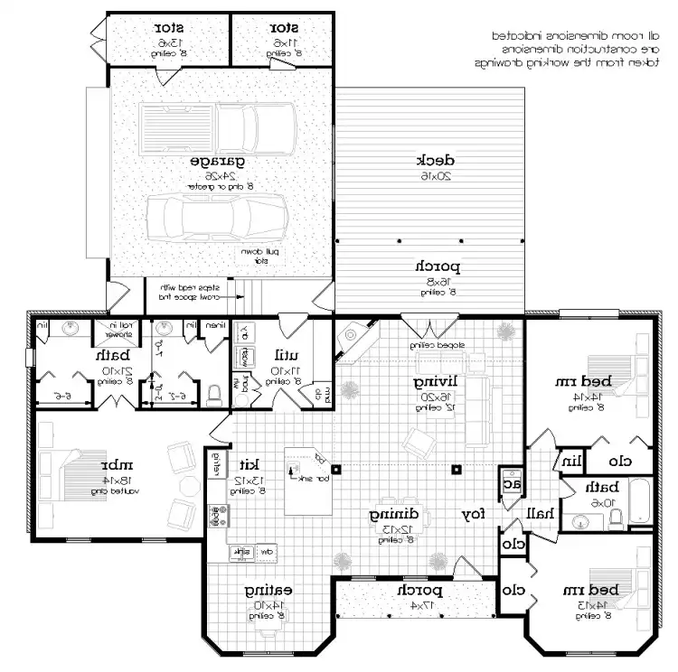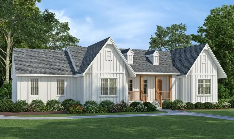 House Plan 9503 is an amazing country-style farmhouse that offers a uniquely accessible design! Behind that cute facade, you'll find 2,004 square feet with three bedrooms and two bathrooms split across the open-concept floor plan. With no partitions beyond the island and peninsula in the kitchen, you'll enjoy clear sightlines, a breezy ambiance, and nothing to get hung up on. The two secondary bedrooms share a hall bath while the primary suite features a private bath with a roll-in shower and two dressing areas, each with a vanity and a closet. This home also has a utility room, porches, and a garage in back with storage space!