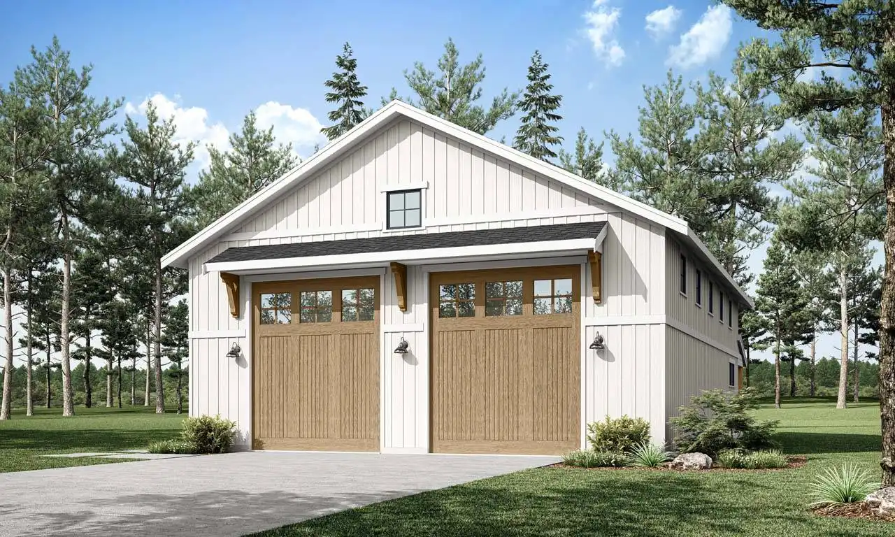 House Plan 9515 has simple barndo style and so much potential! It features two garage bays in front, oversized for even large vehicles. There's also a 725-square-foot ADU apartment in back, complete with open living, one bedroom, one bathroom, and laundry. This is a great design for adding onto an existing property or for downsizing, if you want less house but don't want to give up on garage parking for your cars!