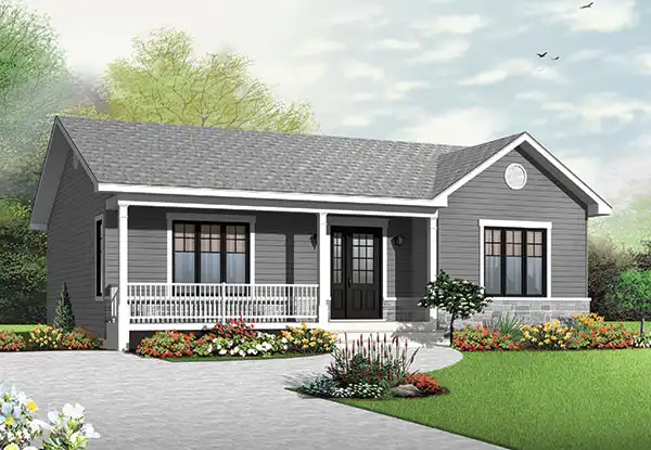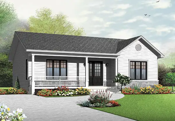 Traditional and affordable 2 bedroom bungalow This delightful model features a full width, covered veranda in front the is sure to be a favorite gathering place during the warmer months. The large entrance foyer has abundant closet space and room for a bench in which to store seasonal items and provide a perfect place to sit while removing boots! The completely open floor plan offers an abundance of natural light from the living room through the dining area with access to the back yard through patio doors and to the "L" shaped kitchen with its a large island that's perfect for informal meals. The two nicely sized bedrooms have abundant closet space and share a full bathroom with separate tub and 3' x 4' shower enclosure.