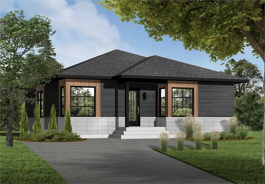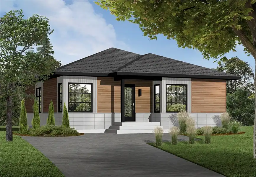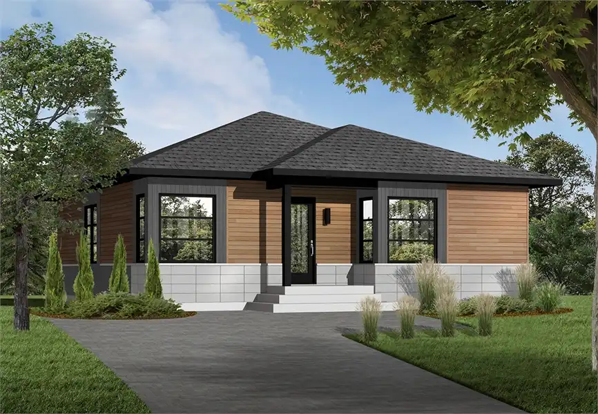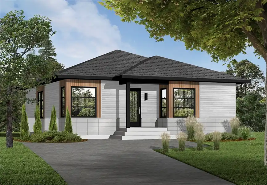 An appealing façade welcomes guests to this two-bedroom contemporary home. Inside, the great room is a nice gathering place for any occasion. Formal or casual meals may be enjoyed in the dining area. The island kitchen incorporates snack space for three. A garden tub anchors the full bath, which serves both bedrooms.