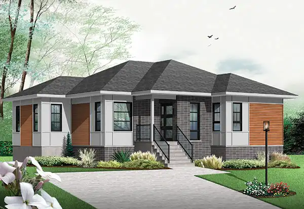 Contemporary style plan is perfect for a new couple or first-time home buyers. The front façade is adorned in ample modern touches, including tall windows and mixed design elements such as stone and wood and a highlighted sloping roof-line. A front drive ends with the walk up to the covered front door, nestled away around the corner. Upon entering, you are greeted with 1,240 square feet of living space amongst this single-story abode. An air-lock foyer protects from the elements and provides a convenient coat closet for guests before opening on to the living room. An open concept then finds the dining room and kitchen nearby, as well as a walk-in pantry and backyard access. Past the kitchen you’ll find a small hallway with a shared full bathroom and two large bedrooms, each with their own walk-in closets. What this home may lack in size, it makes up for in character, providing an affordable and trustworthy plan that is as amazing as it is functional.