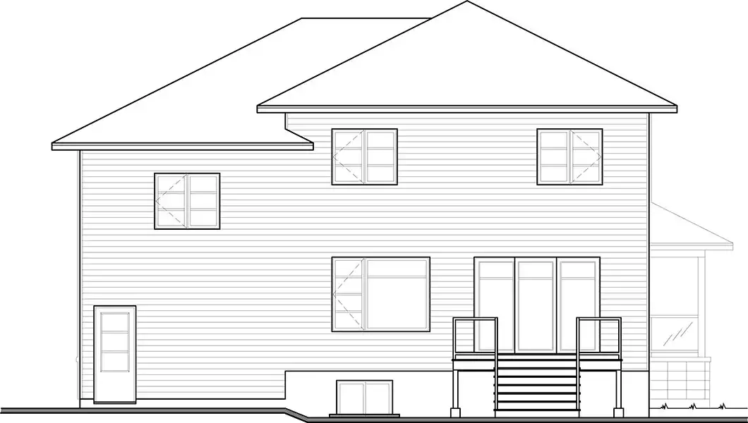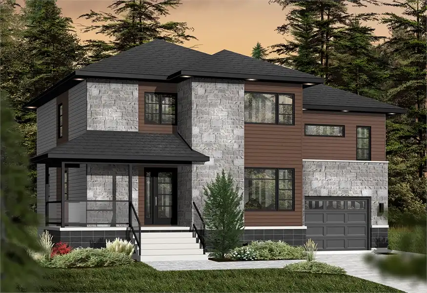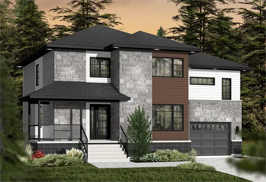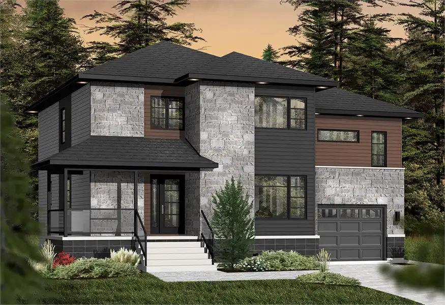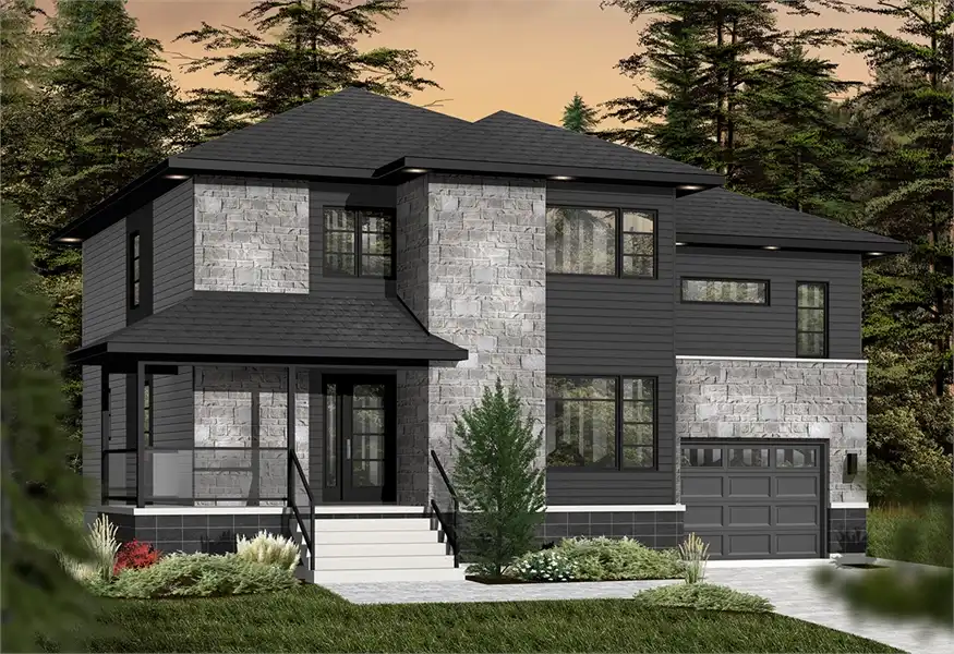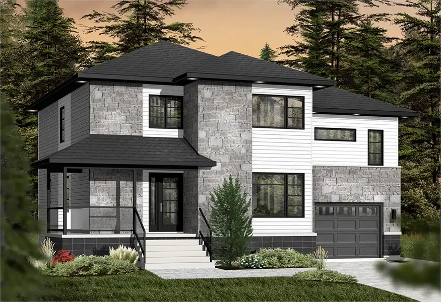 A tasteful front porch welcomes visitors to this modern four-bedroom design. Inside, a nearby powder room allows the travelers to freshen up. Catch up on the latest news while relaxing in the cozy great room. The kitchen's island offers snack space for five. Sliding glass doors give access to the backyard. Start going up the stairs and you'll find an intermediate level above the garage, containing a comfortable family room and a sizable bedroom. The master suite is found several more steps up, along with two more bedrooms.