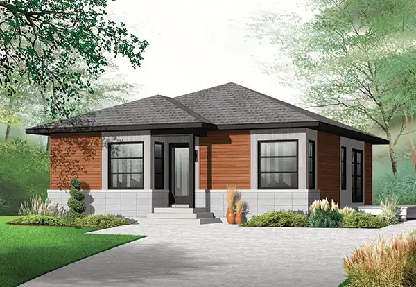 This contemporary one-story is sure to draw compliments from neighbors and passersby. Inside, the great room will be the main gathering place. The eat-in kitchen opens to the side yard via sliding glass doors. The two bedrooms flank a full bath, which contains a large tub and a separate shower. Stairs lead down to the daylight basement, which effectively doubles your usable square footage. Of course, the home can be built on any foundation that you choose.