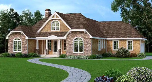 This appealing looking craftsman ranch house plan has much to offer. Dramatic 10-11 foot high ceilings predominate throughout. The large great room is a focal point with windows on the front and rear and a full fireplace/built-in wall viewable from the kitchen and dining as well. It is a split bedroom plan with a private master with a large bath and walk-in closet. The other two bedrooms have direct access to a bath they share. There is a big breakfast bar in the kitchen which opens to a spacious covered porch. Bonuses include an optional second floor room and an optional walk-out basement plan.