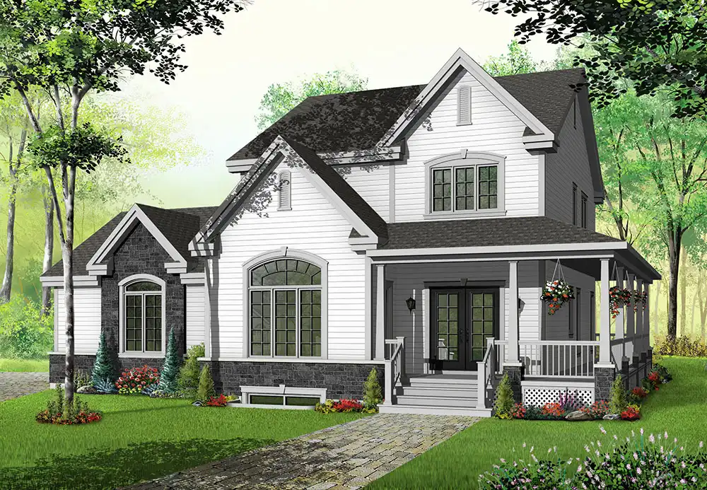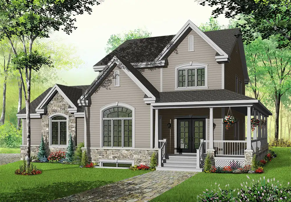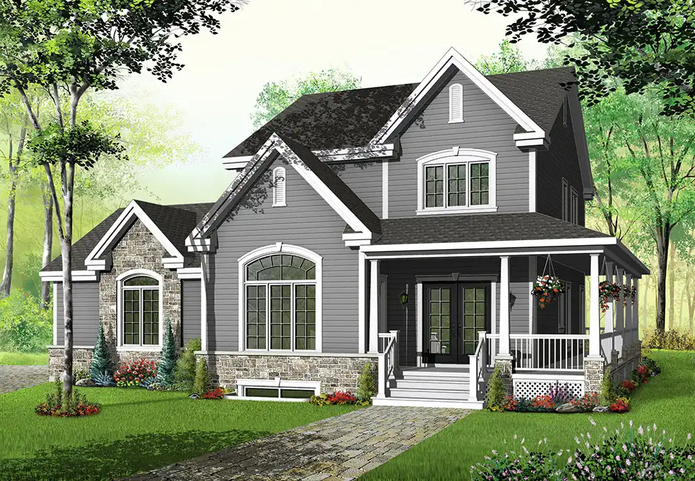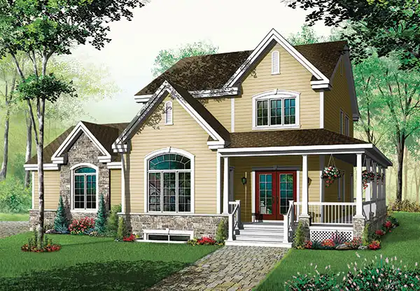 Arches, gables and a wraparound porch adorn this two-story farm house. Inside, the air-lock entry features a large coat closet. A fireplace warms the delightful great room. The island kitchen serves any meal with style and grace. Upstairs, the spacious master suite enjoys a posh private bath. Two more bedrooms share a split bath.
