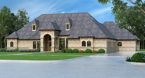 This four-bedroom European house plan boasts a nostalgic, charming façade. The spacious layout of the home plan offers plenty of extras in its 4,534 square feet. If you love to entertain, you'll appreciate how the open kitchen flows into the sizable family room. Expand any party to the outdoor living area. Dinner guests will feel important in the tasteful dining room. A curved wall of windows enhances the peaceful breakfast nook. The luxurious master suite is secluded and restful. Note the garden tub and the vast wardrobe. A second bedroom suite nicely accommodates overnight guests. In a far corner of the home, your children will enjoy their two bedrooms and two baths. Spend an afternoon in the study with a good book; French doors provide outdoor access. Note the amazing four-car garage!