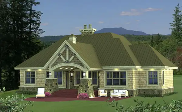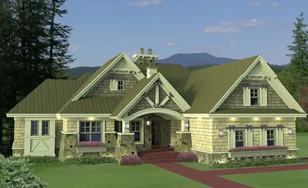 Craftsman-style details enhance the curb appeal of this three-bedroom house plan, creating a warm and inviting exterior. Inside, a flexible front room can easily function as a formal dining room, home office, or multipurpose living space. The spacious great room is highlighted by a striking see-through fireplace that connects seamlessly to the covered patio, making it ideal for indoor-outdoor living. The island kitchen features a convenient nearby pantry for added storage and efficiency. A spa-like soaking tub anchors the luxurious primary suite, while a versatile bonus room above the two-car garage provides extra space for a media room, playroom, or guest retreat.