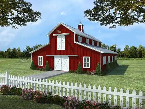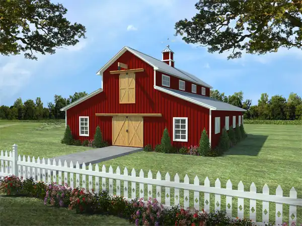This full featured apartment barn design includes a drive through tractor storage, hay storage, tack/feed room, 2 stalls, a live in apartment, and hay loft above. First Floor: 2,289 sf (741 sf heated in 1st floor apartment & 1,548 sf un-heated). Second Floor: 810 s f un-heated.