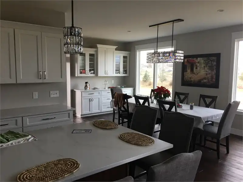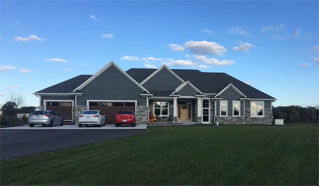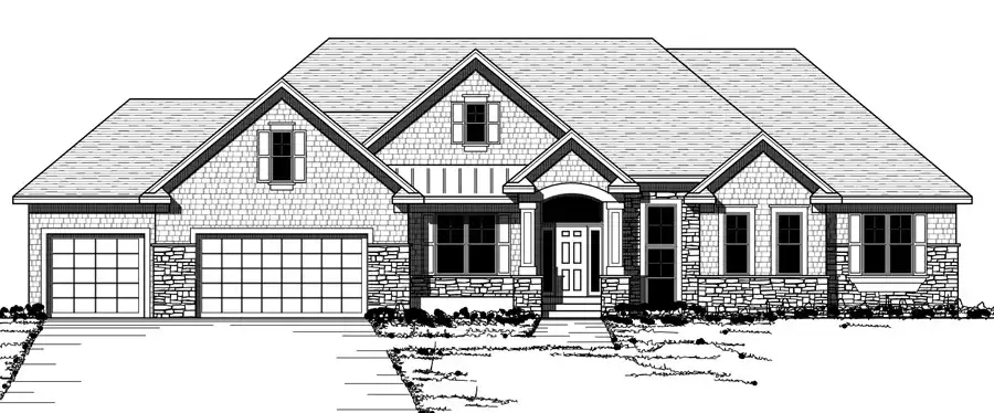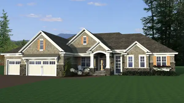 Shutters, columns and a front porch give a country feel to this one-story home design. The central great room anchors the floor plan, and shows off a dramatic high ceiling. The island kitchen serves any meal tastefully. The adjacent hearth room is perfect for cozy conversation. Across the home, the owner's suite boasts a splashy garden tub and a separate shower.