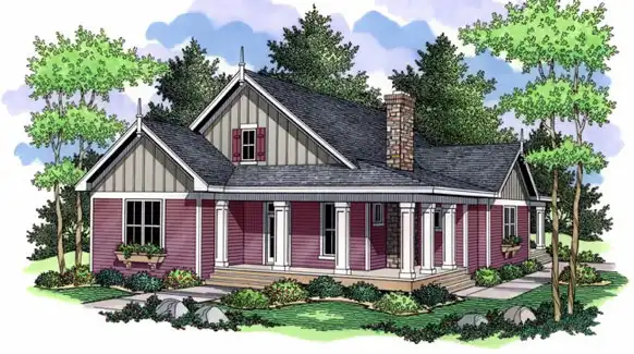 Welcoming gables and columns adorn this affordable cottage house plan, with three bedrooms, two baths and 1,811 square feet of living area. Beyond the front porch, a fireplace warms the comfortable family room in this home design. The island kitchen features a good-sized pantry. Note the fun snack bar and the cozy dinette. When weather permits, step out back to dine al fresco. When you need some relaxation, head for the owner's suite and read a book in the bayed sitting area. Note the sizable walk-in closet. Refresh yourself in the personal bath, with its garden tub, custom shower and two sinks. Two additional bedrooms with walk-in closets share a hall bath. Builders point out the peaceful loft at the top of the stairs in this home design. The bonus room would make a nice playroom for the kids.
