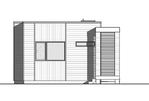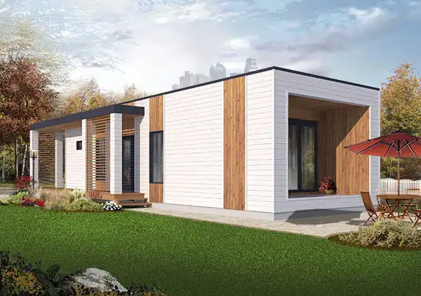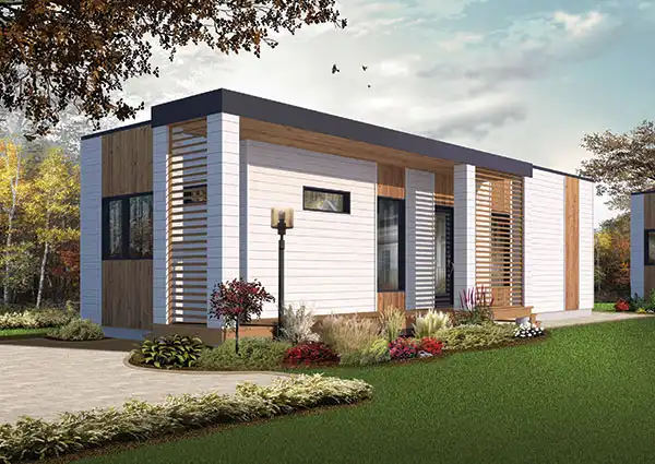 This modern two-bedroom home makes a bold statement in any neighborhood. Enter the home off the side porch. Then open a pocket door to reveal the main living spaces. The efficient kitchen boasts a peninsula eating area. The family room opens to a rear porch and the backyard beyond. Two bedrooms share a full bath.