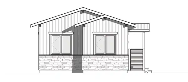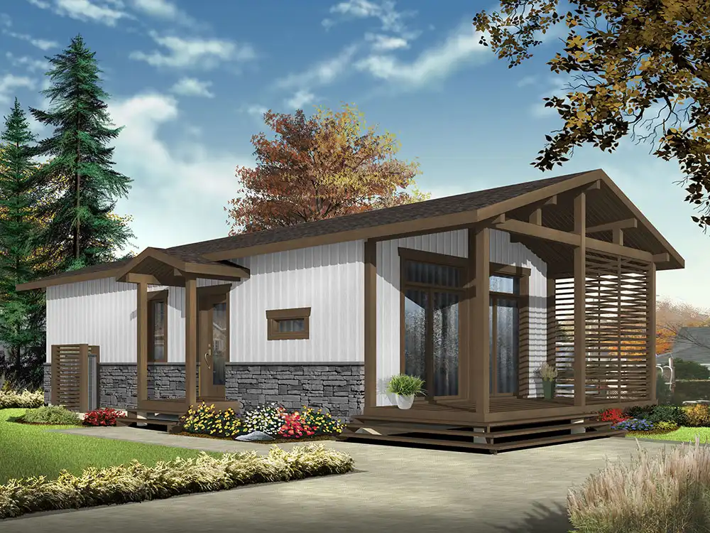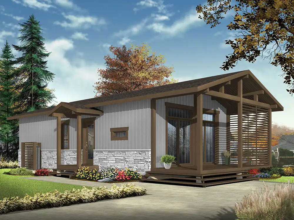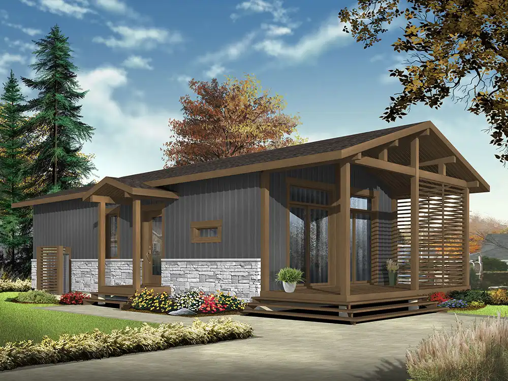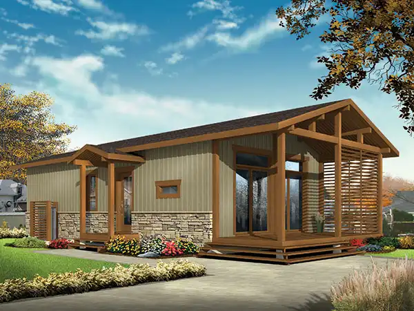 This one-story ranch design offers a large porch or deck, and would be suitable for a lake lot or your property in the woods. The side entry introduces a handy coat closet. The eat-in kitchen and the living room open to the deck via sliding glass doors. The dining room is perfect for any meal. Two cozy bedrooms share a hall bath. A laundry closet lies near the bedrooms.