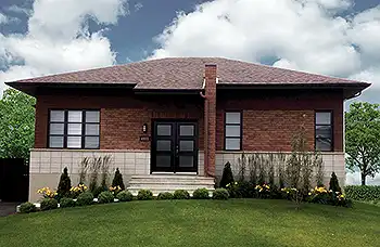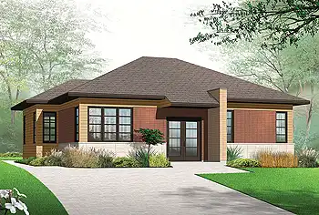 Hip rooflines and plenty of glass dress up this two-story contemporary design. French doors welcome visitors into the foyer, with its handy coat closet. Two steps up, the main floor includes the friendly living room, which is perfect for conversation. The island kitchen boasts a snack area for four. The dining room opens to the backyard via sliding glass doors. Two bedrooms offer private relaxation. A washer and dryer are located in the large bath. The daylight basement level effectively doubles the living area.