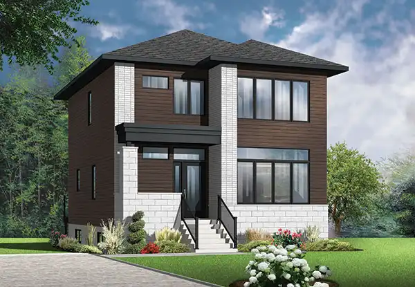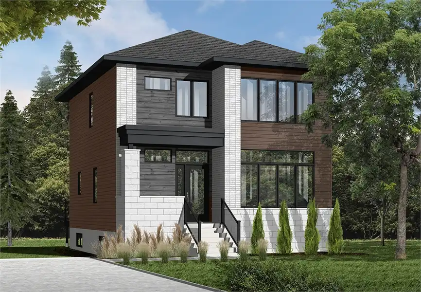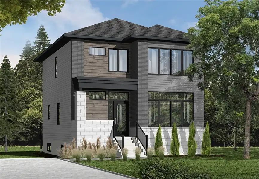 Are you drawn to modern house plans with sleek lines and plenty of windows? Then this three-bedroom home plan could be perfect, with its 1,768 square feet of living space and inviting front porch. Entertain friends and family in the open kitchen, good-sized dining room and comfortable living room. Other features of the home design include the master suite's walk-in closet, the cozy foyer and the useful laundry room. Our customers love the kitchen's snack area for four. Don't overlook the full basement, which is great for storage, recreation and future rooms.