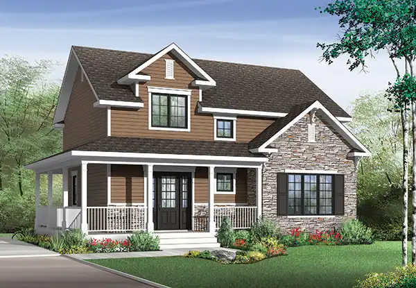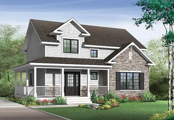 Are you looking at two-story cottage house plans to find the perfect one? This cute home plan offers three bedrooms, 1.5 baths and a total of 1,616 square feet of living area. The open kitchen in this home design flows gracefully into the versatile dining area and the sizable great room. Don't overlook the wraparound porch and the French doors that open to a back deck. Our customers love the kitchen's snack space for three. The full basement gives you plenty of expansion space.