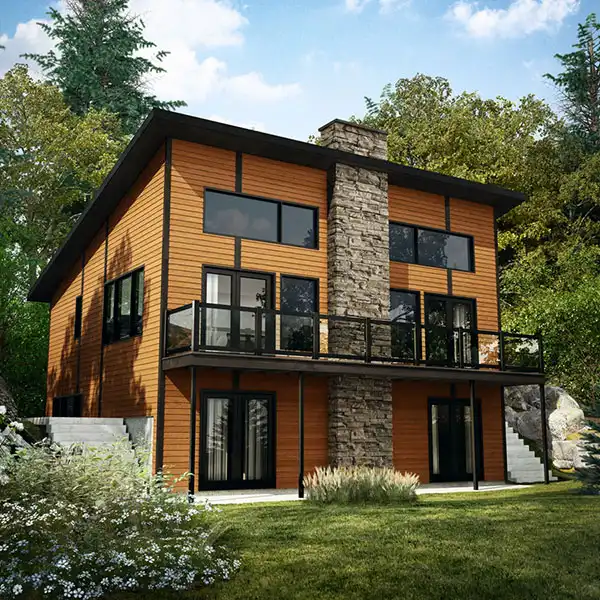 This modern two-story house plan is actually a one-story with the bedrooms in the walkout basement. The home plan includes three bedrooms, 2.5 baths, and 1,792 square feet of living area. A vaulted ceiling presides over the main living areas, and the open kitchen easily serves the dining room and great room. Builders point out the breezy deck. The peaceful master suite anchors the lower level of the home design. Don't overlook the cozy family room in the basement, where sliding glass doors open to a sheltered patio.