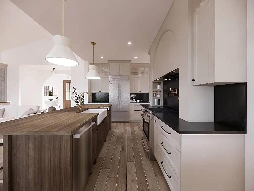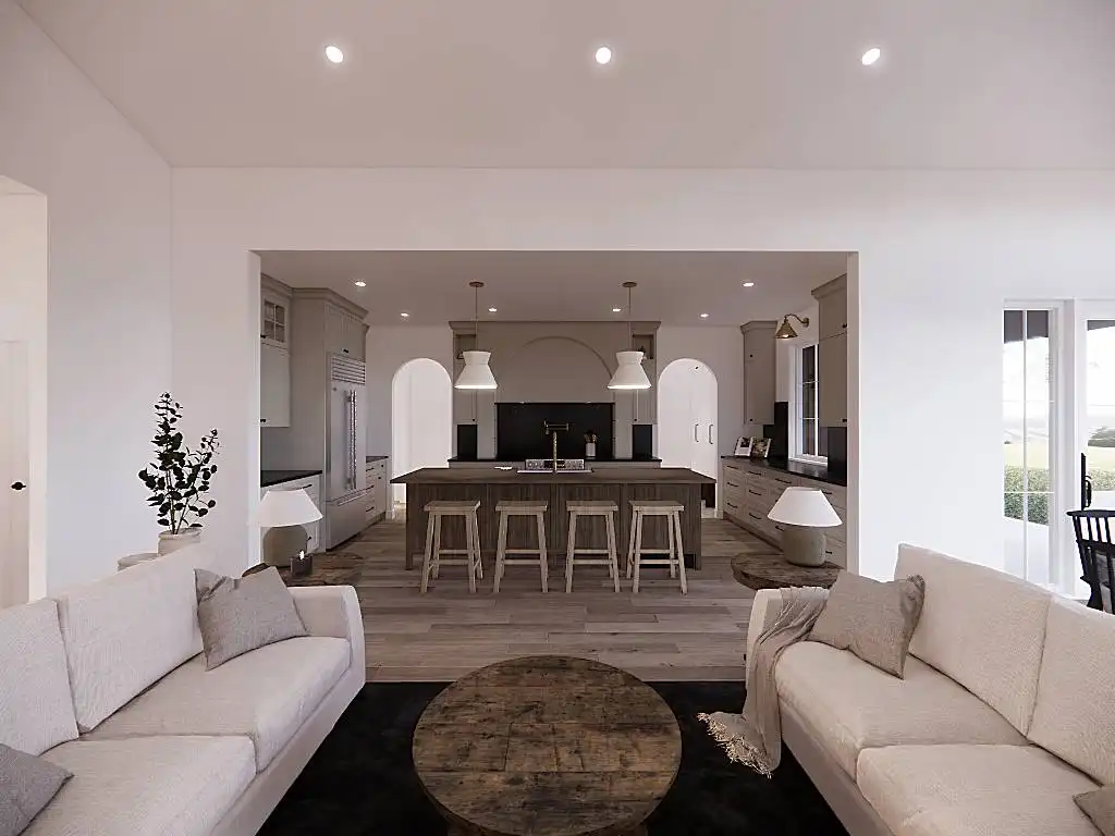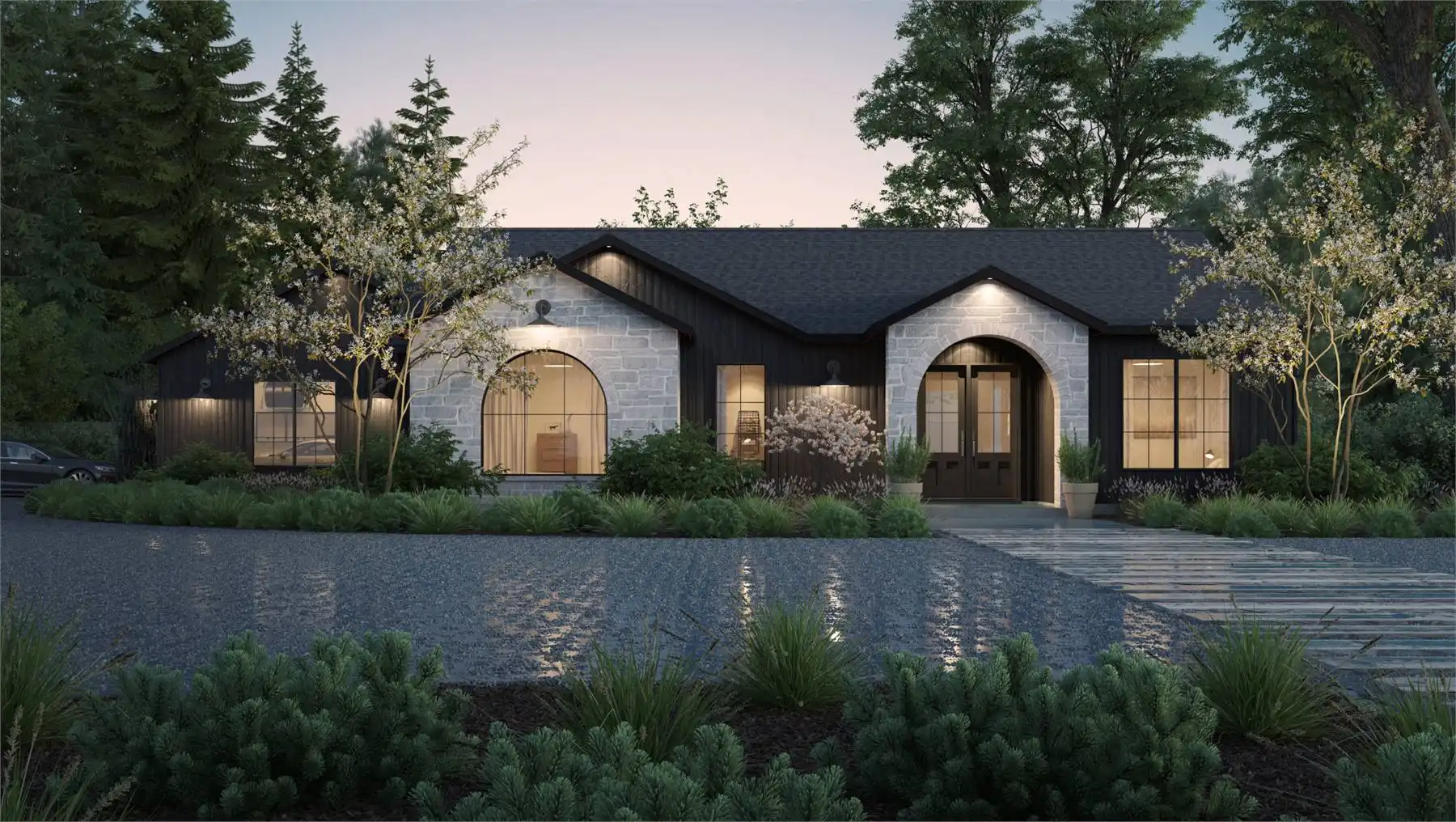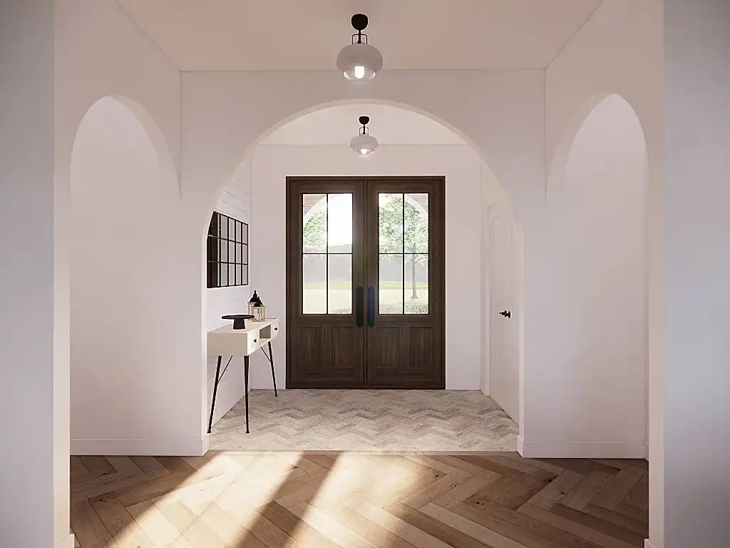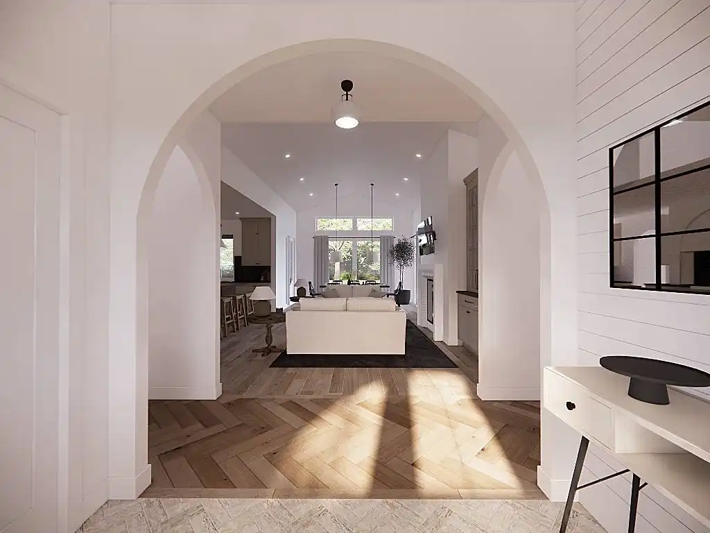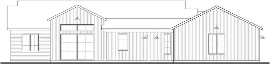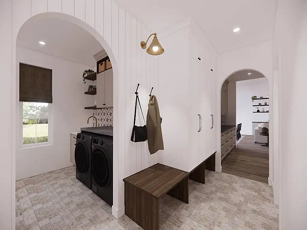 House Plan 9751 is a lovely transitional ranch with 1,947 square feet, three bedrooms, two-and-a-half bathrooms, and a one-car garage hidden in back with side entry. The layout places the open-concept living in the center. There's a U-shaped island kitchen and a vaulted ceiling that spans the living and dining areas. The bedrooms are split across this, with a five-piece primary suite off the kitchen and a hallway with two bedrooms and a hall bath near the foyer. But that's not all! A handy office and a mudroom with the powder bath and laundry room round out this design.