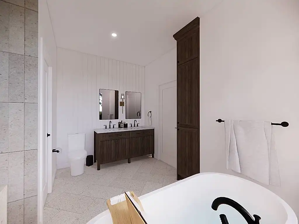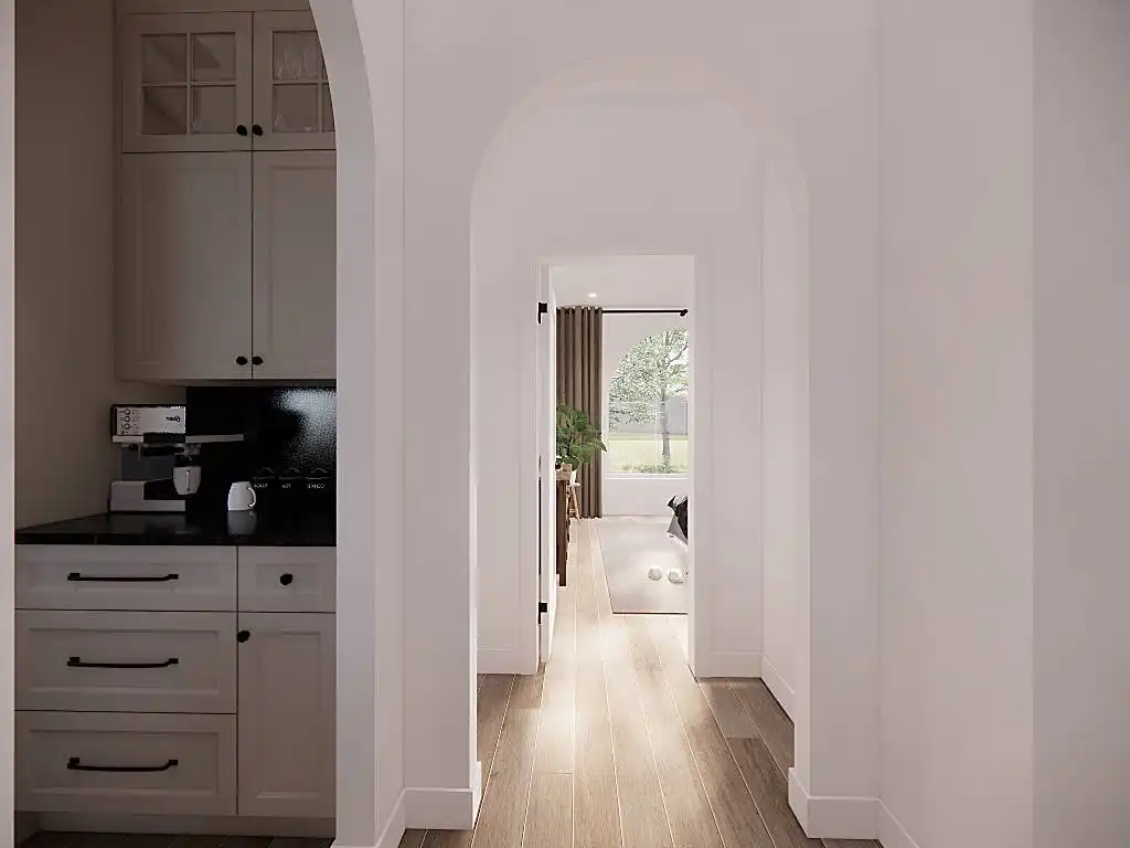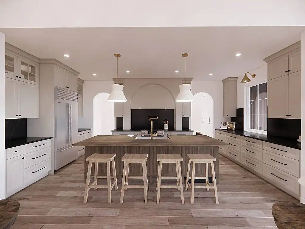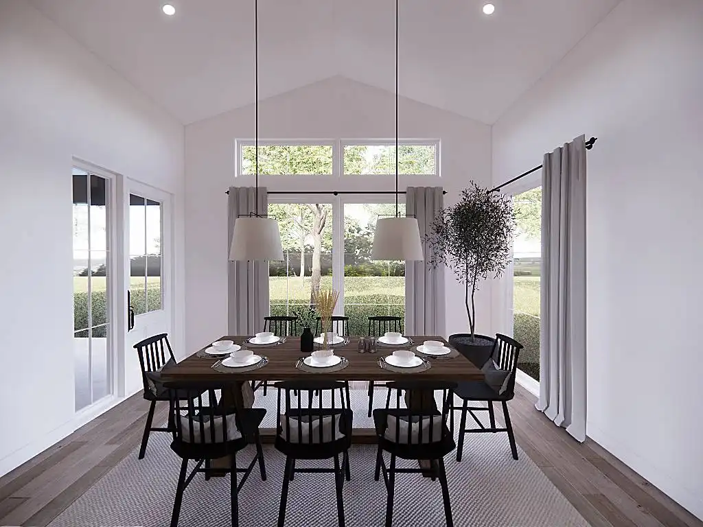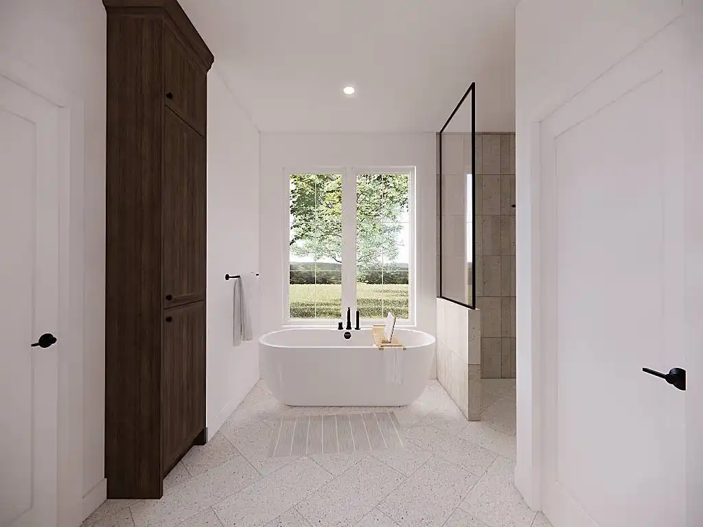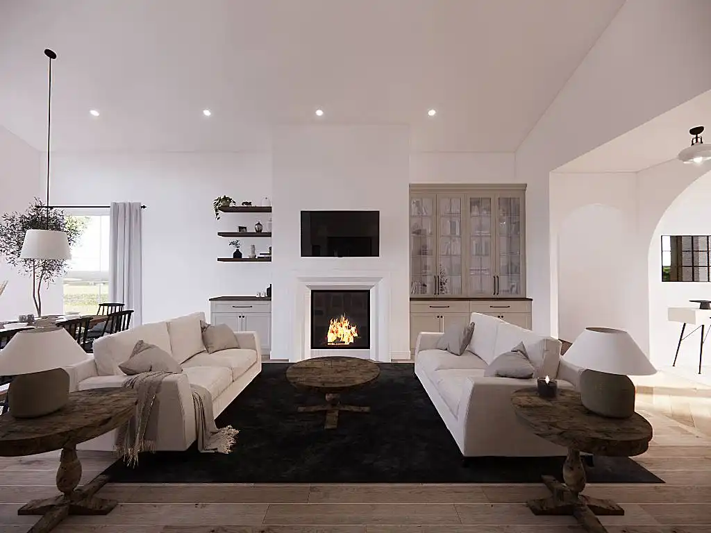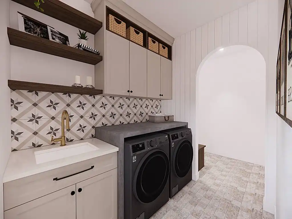 House Plan 9751 is a lovely transitional ranch with 1,947 square feet, three bedrooms, two-and-a-half bathrooms, and a one-car garage hidden in back with side entry. The layout places the open-concept living in the center. There's a U-shaped island kitchen and a vaulted ceiling that spans the living and dining areas. The bedrooms are split across this, with a five-piece primary suite off the kitchen and a hallway with two bedrooms and a hall bath near the foyer. But that's not all! A handy office and a mudroom with the powder bath and laundry room round out this design.