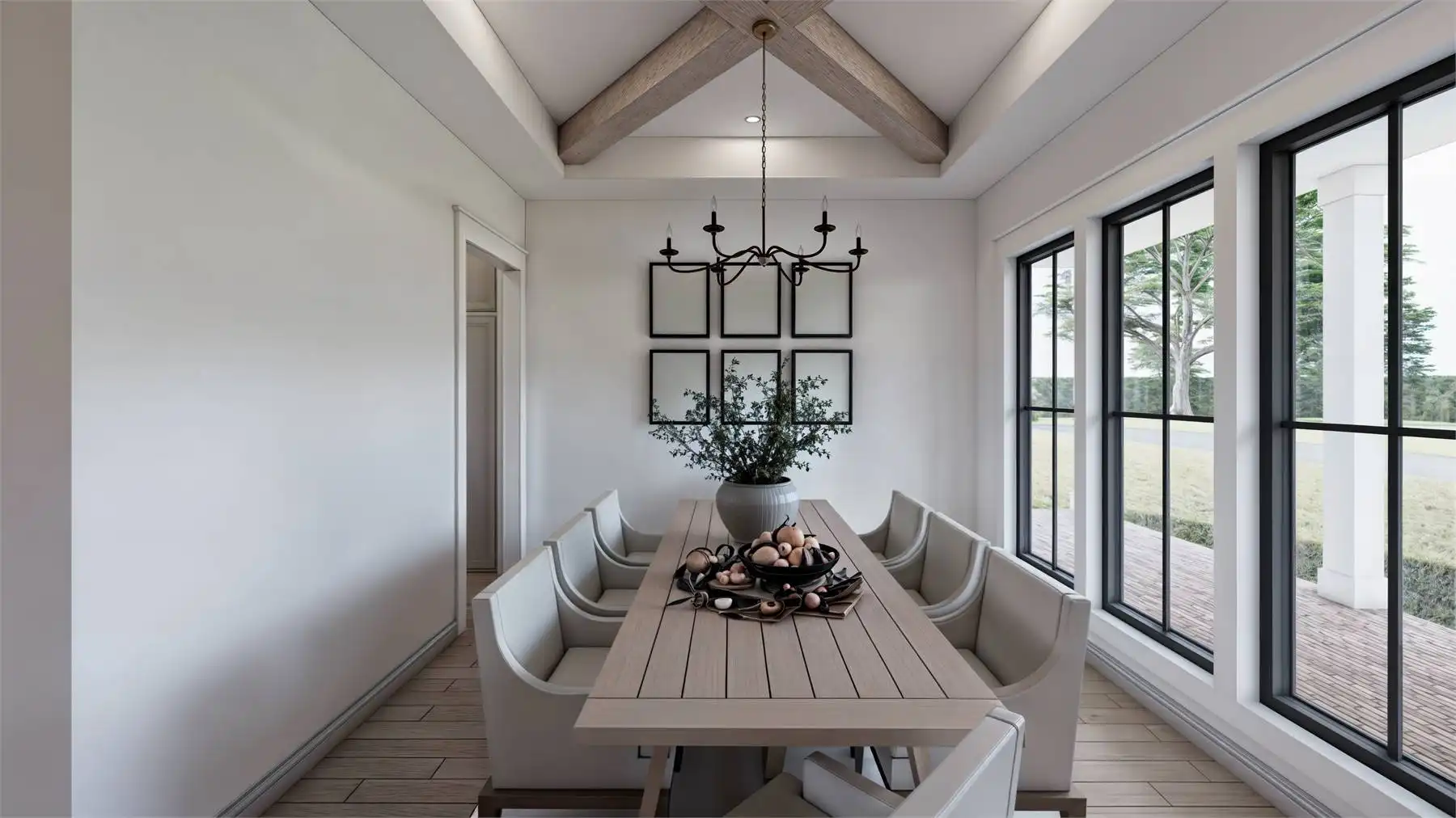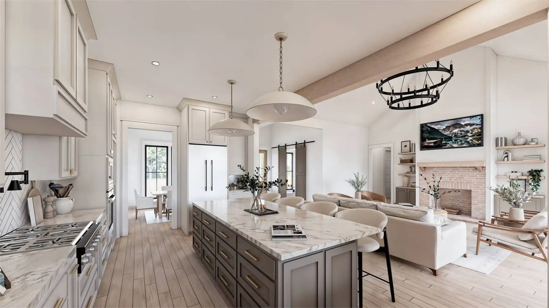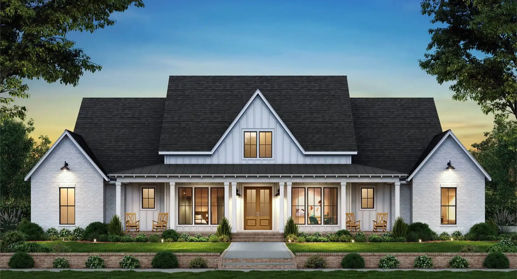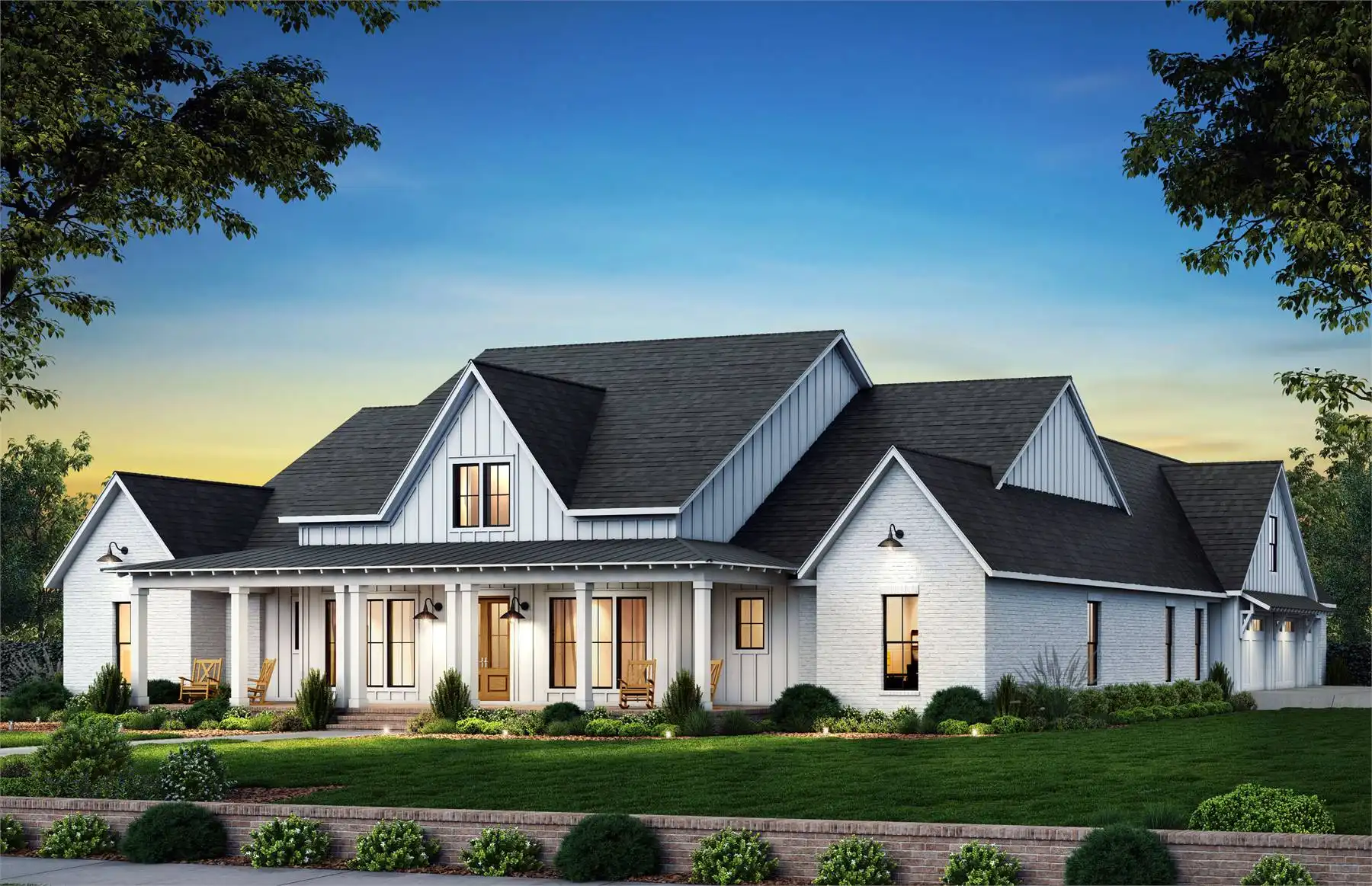 House Plan 9752 is a beautiful one-story Modern Farmhouse offering 3,292 square feet of living space, with 4 bedrooms, 3.5 bathrooms, and a home office. The exterior features exposed rafter tails, a metal roof, stone accents, and board and batten siding for a timeless look. Inside, the open layout is perfect for family living, and the optional bonus room offers extra space with the potential for an additional half bath.